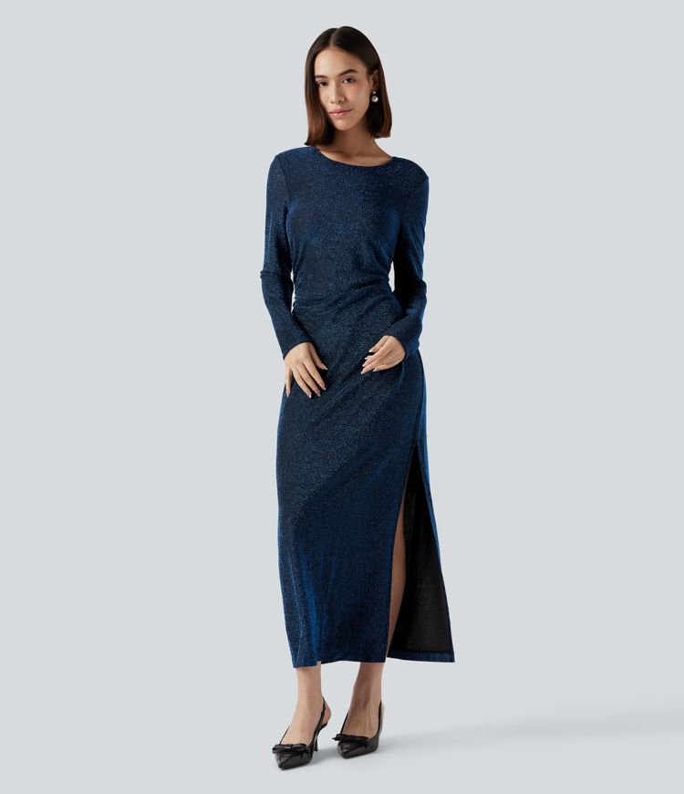 Robe midi fendue à manches longues, dos noué avec découpes, effet sparkle