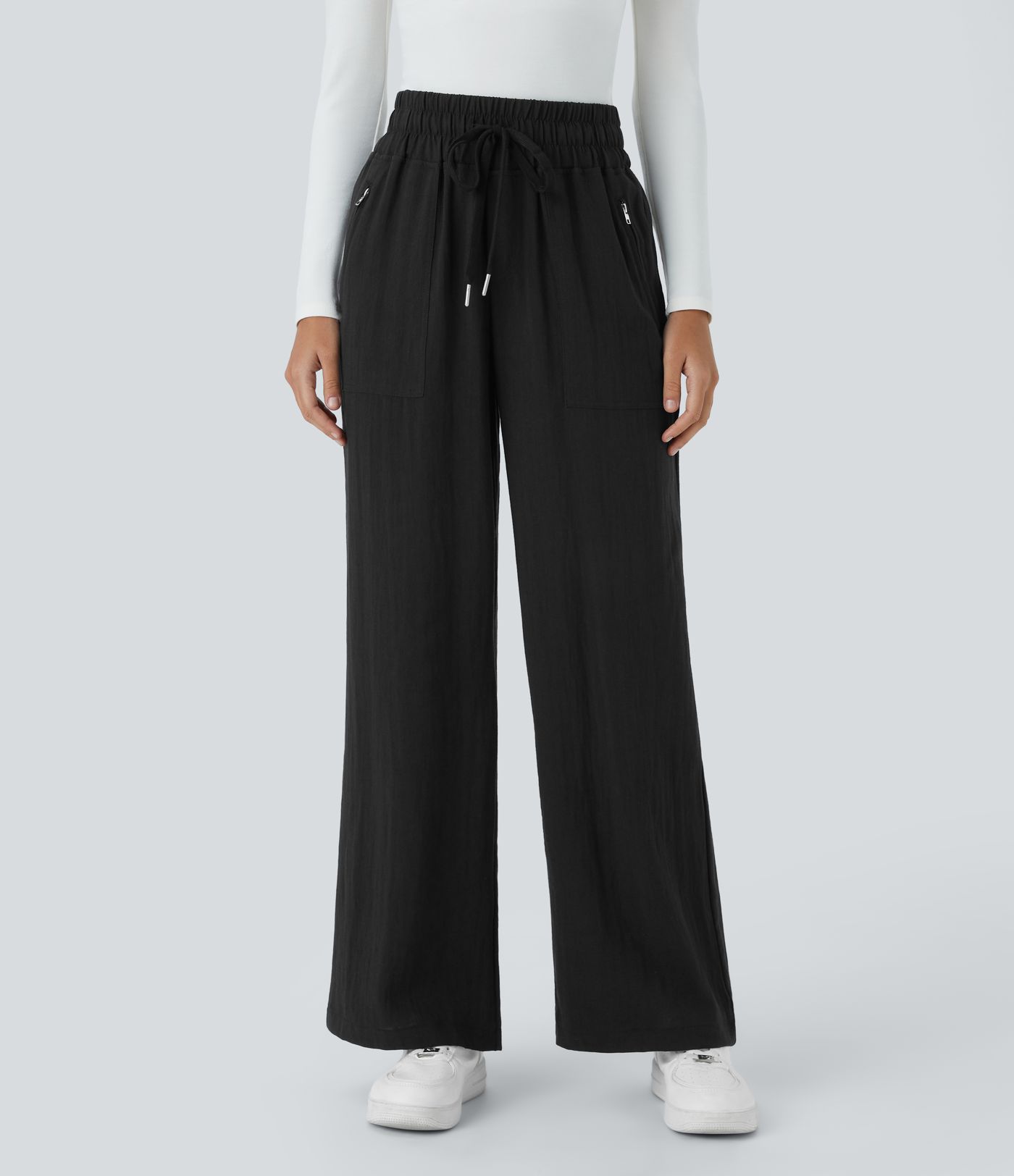 Pantalon Casual Large Taille Haute avec Cordon de Serrage Poches Latérales à Fermeture Éclair - Effet Lin