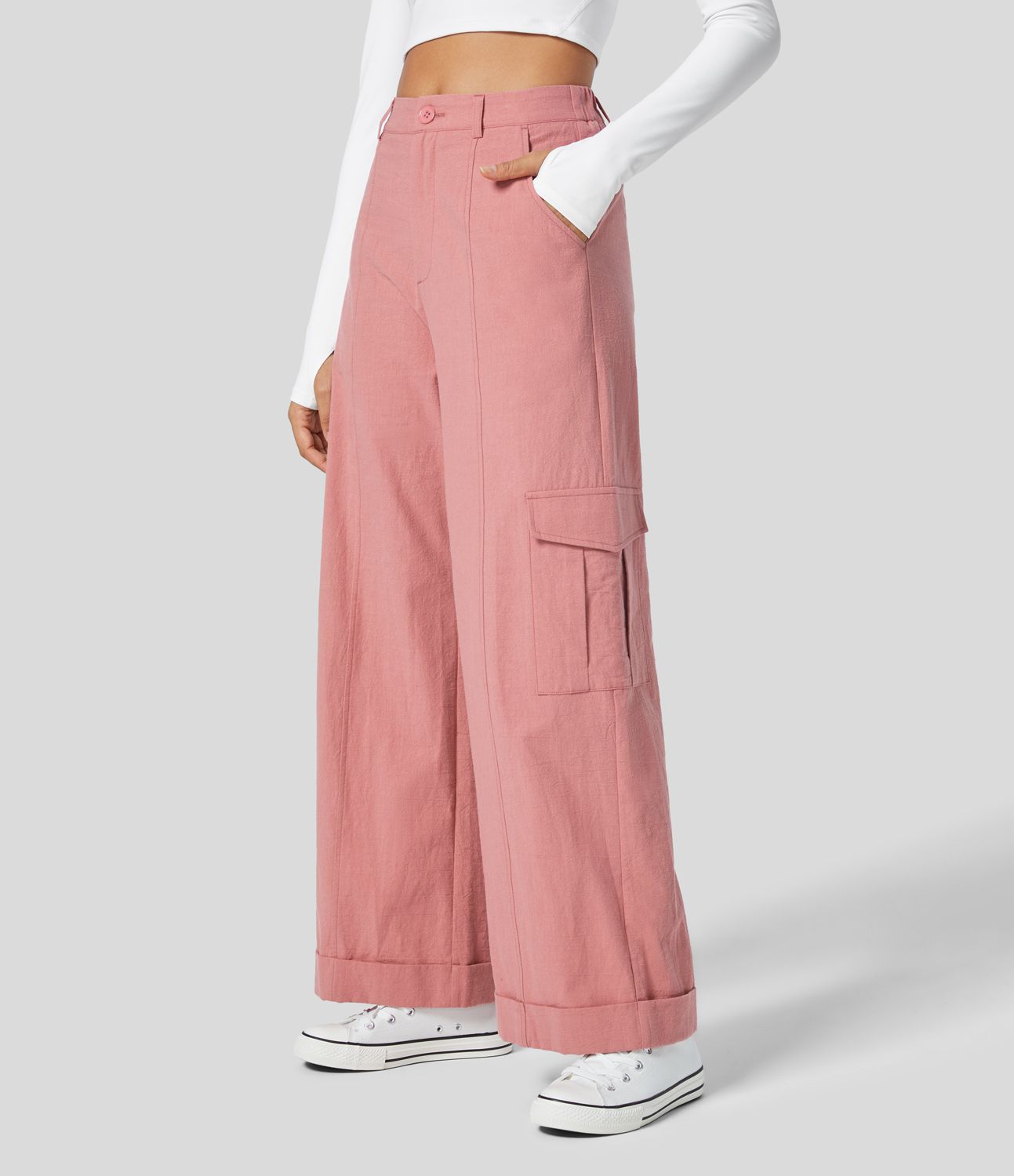 Pantalon Cargo Casual à Jambes Larges Taille Haute Boutonnées Fermeture Éclair Multiples Poches et Effet Lin