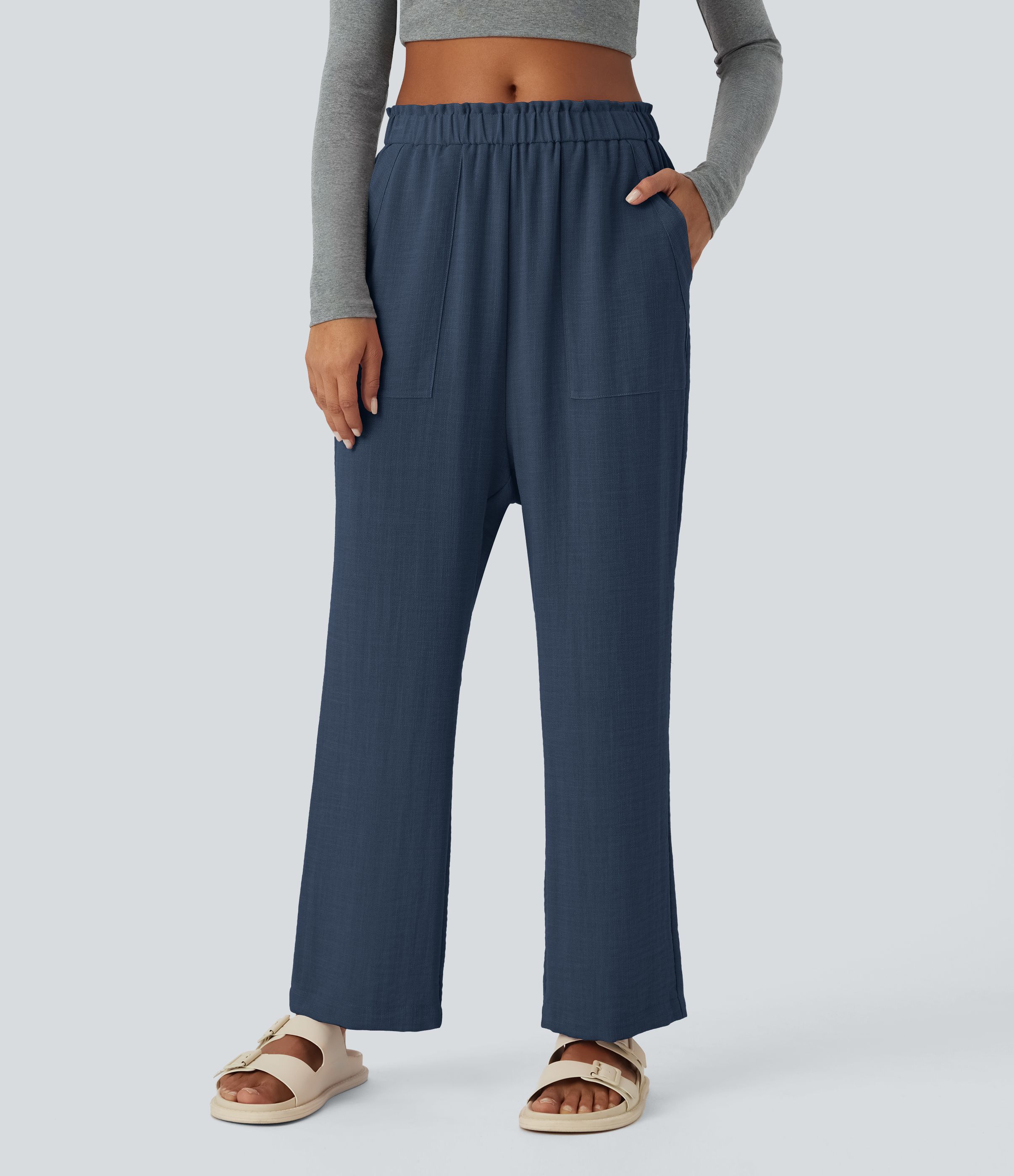 Pantalon Harem Taille Basse avec Fronces Poches Multiples et Effet Lin pour le Resort