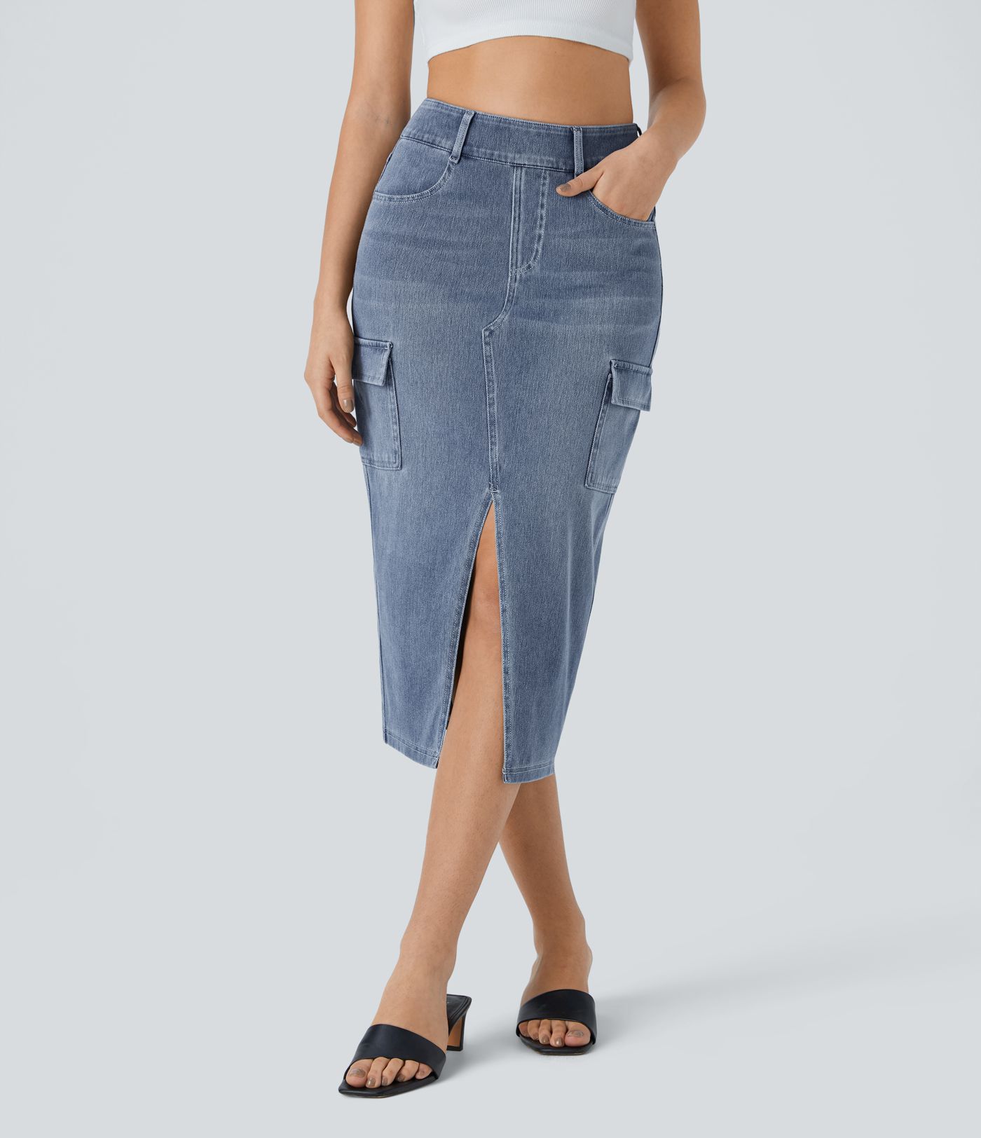 Halara Flex™ Jupe en Jean cargo mi-longue tricot extensible lavé, taille haute, poches multiples, moulante avec fente