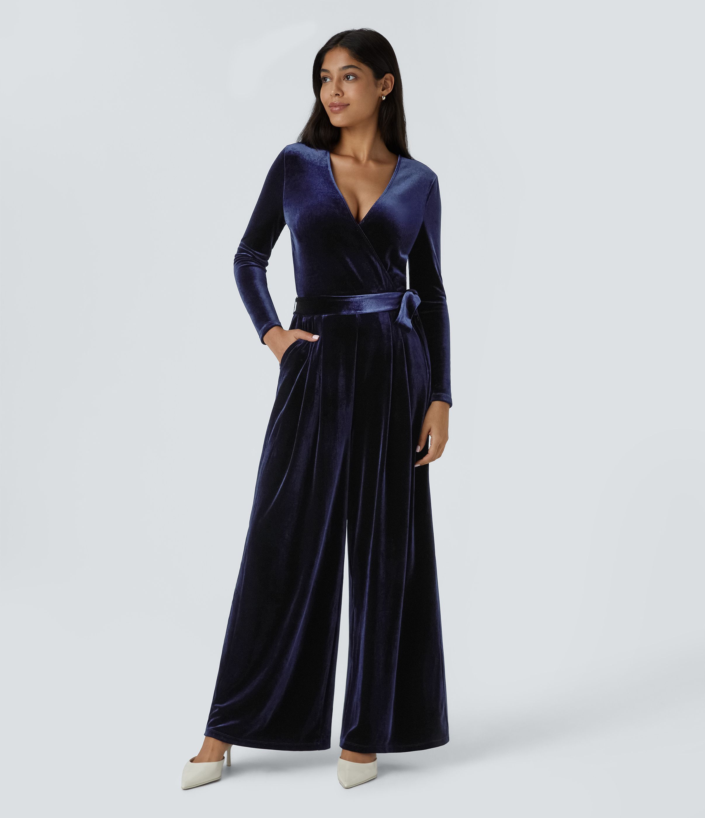 Combinaison décontractée en velours à col en V, manches longues, ceinture, poches et jambes larges
