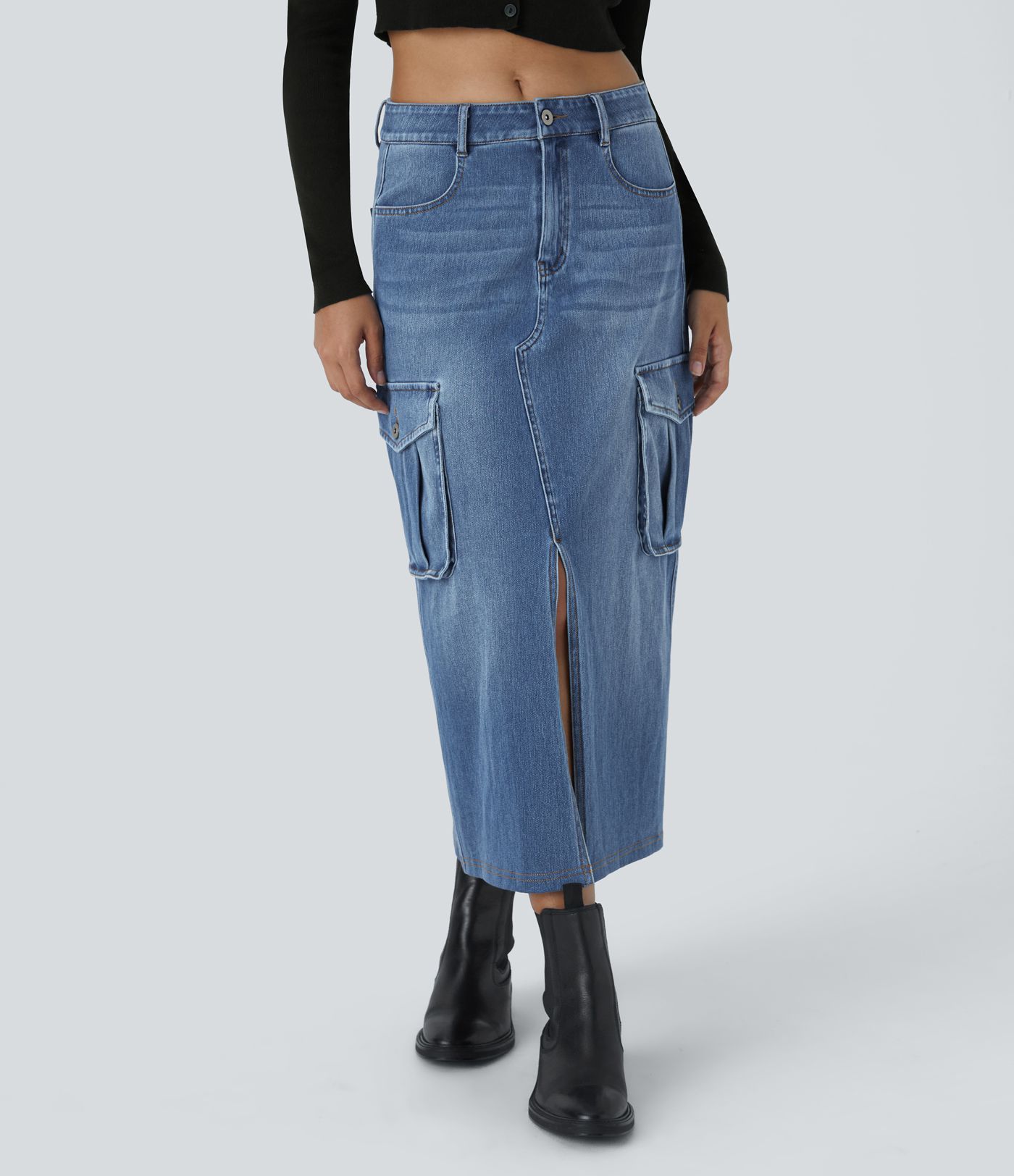 Halara Flex™ Jupe en Jean longue cargo extensible, taille mi-haute, coupe évasée, avec boutons, fermeture éclair, poches multiples et fente