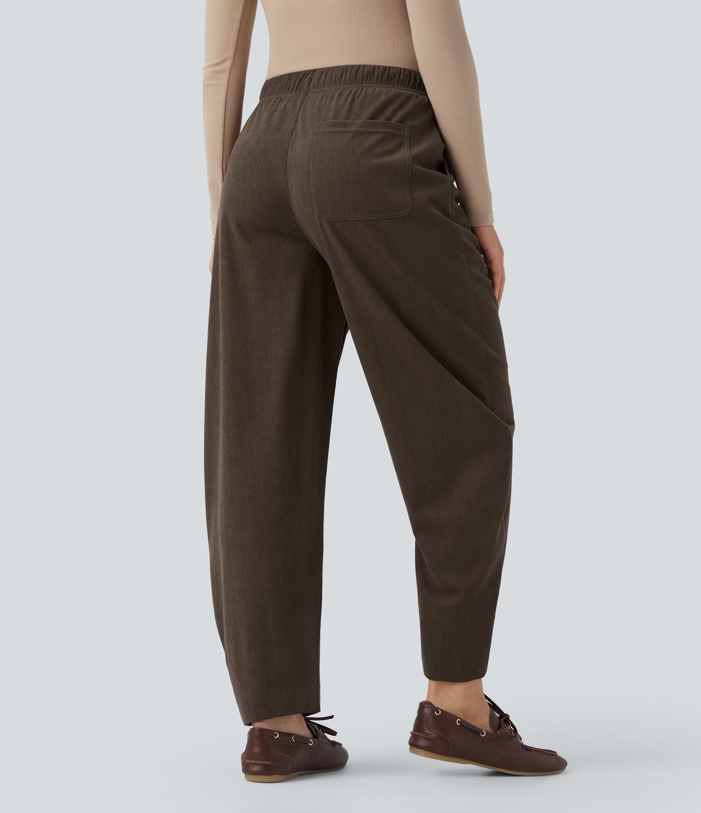 Pantalon décontracté velours côtelé taille mi-haute coupe barrel avec cordon de serrage et poches