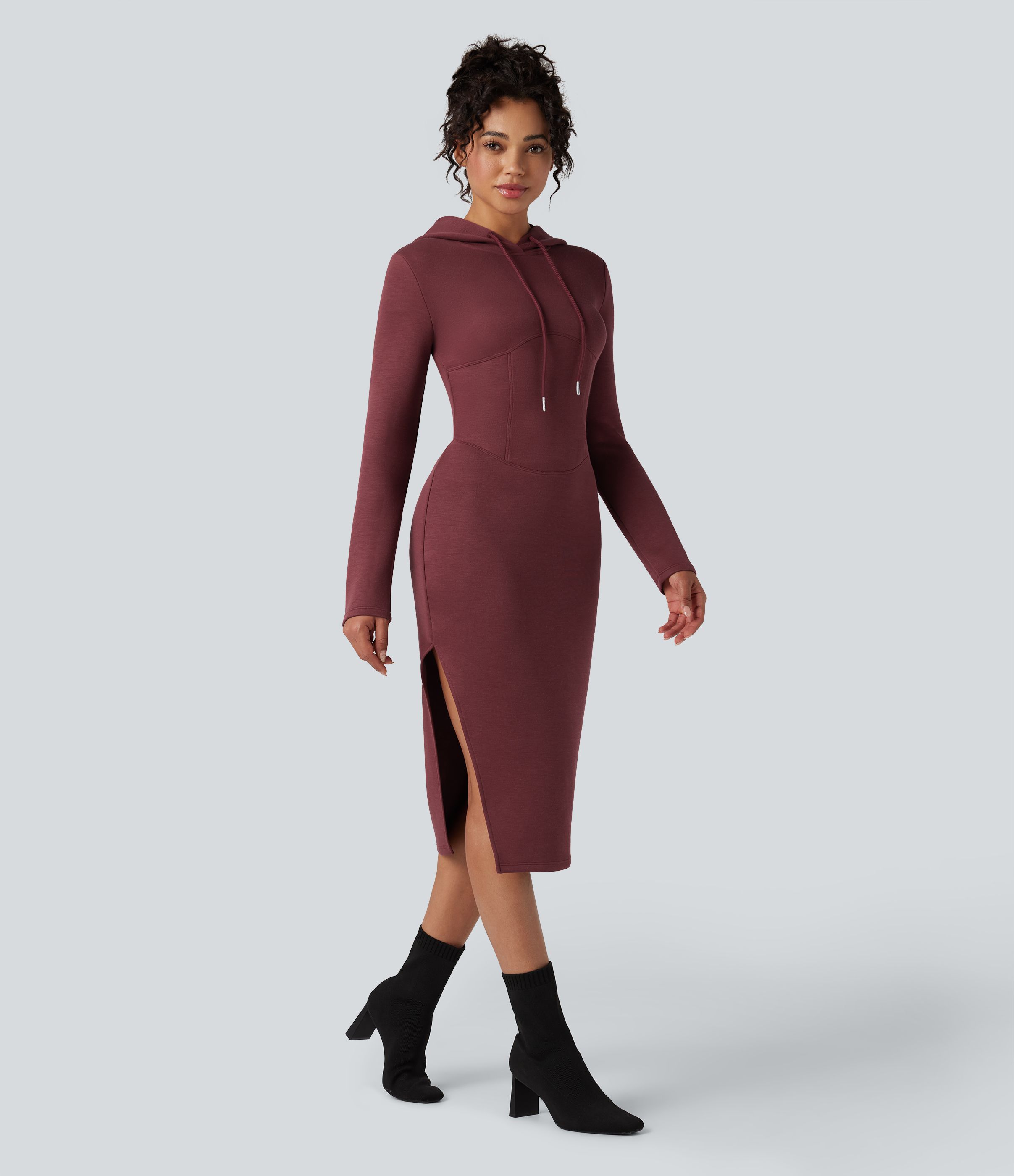 Robe sweat mi-longue fendue à capuche manches longues