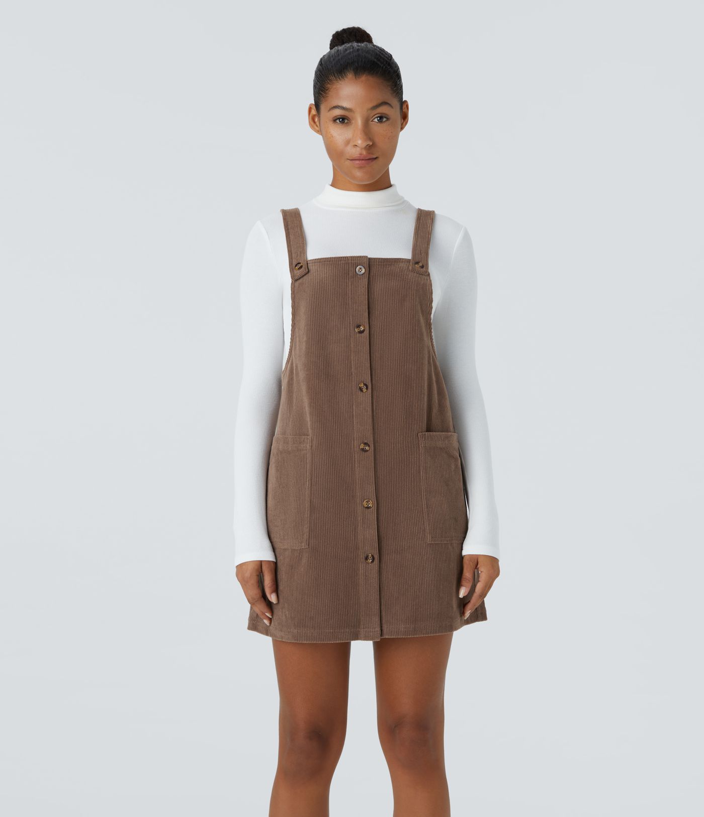 Robe salopette courte décontractée en velours côtelé avec bretelles ajustables, boutons et poches latérales