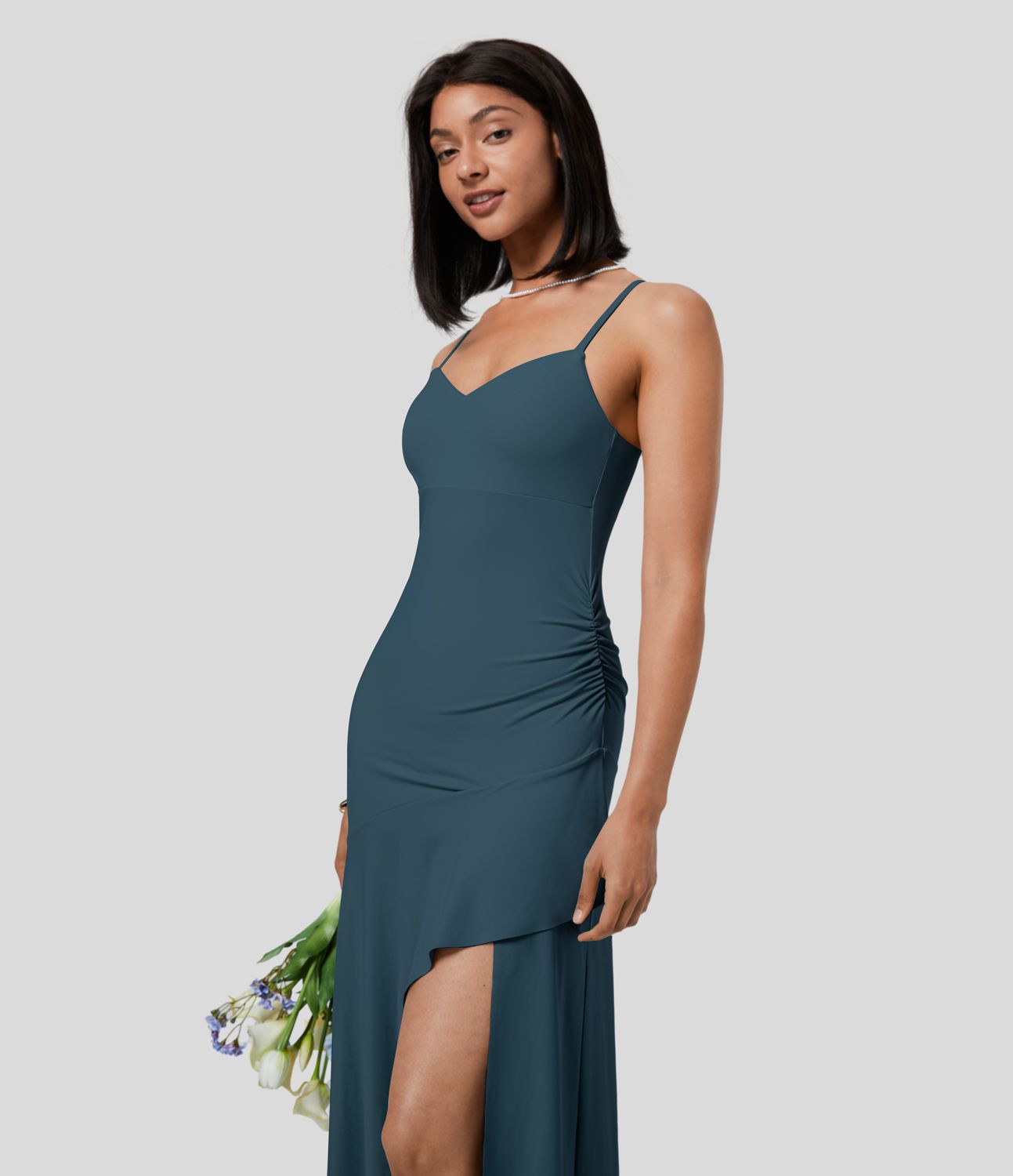 Robe Maxi Fluide Demoiselles d'Honneur et Invitée de Mariage avec Dos Nu Réglable Ruché et Fente