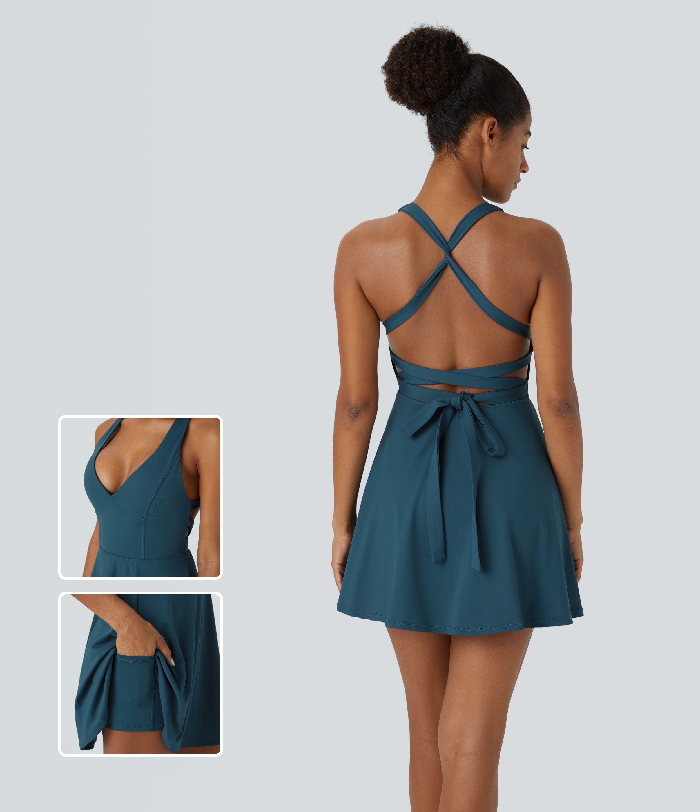 Robe Sport de Danse Mini Évasée 2-en-1 à Dos Nu Liens Croisés et Poches