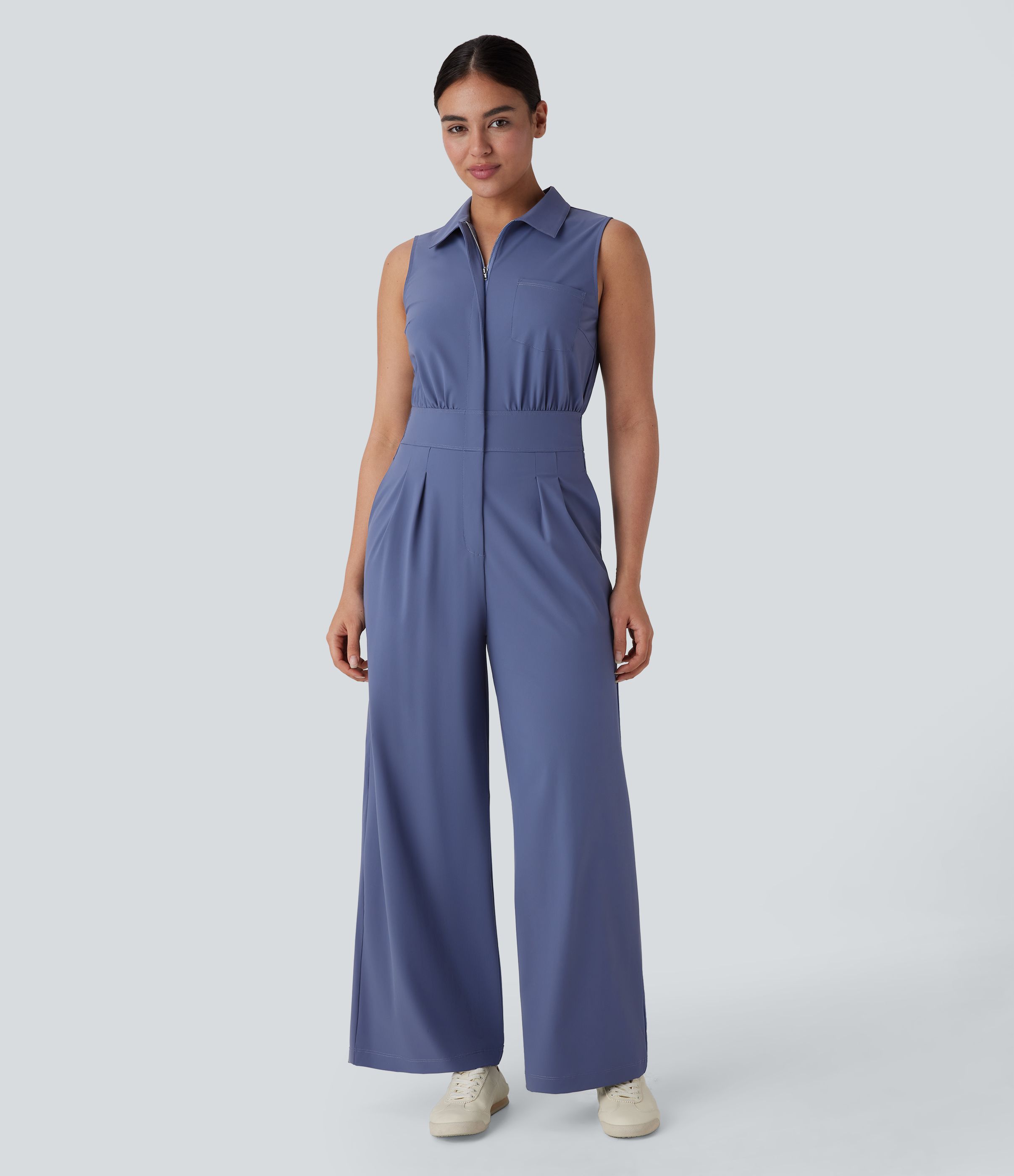 Combinaison de travail à col, sans manches, fermeture éclair et poches multiples