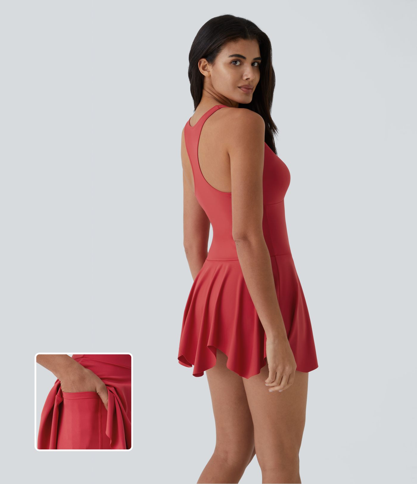 Robe Casual Mini Évasée 2-en-1 à Col V Profond Dos Nageur et Poches Latérales