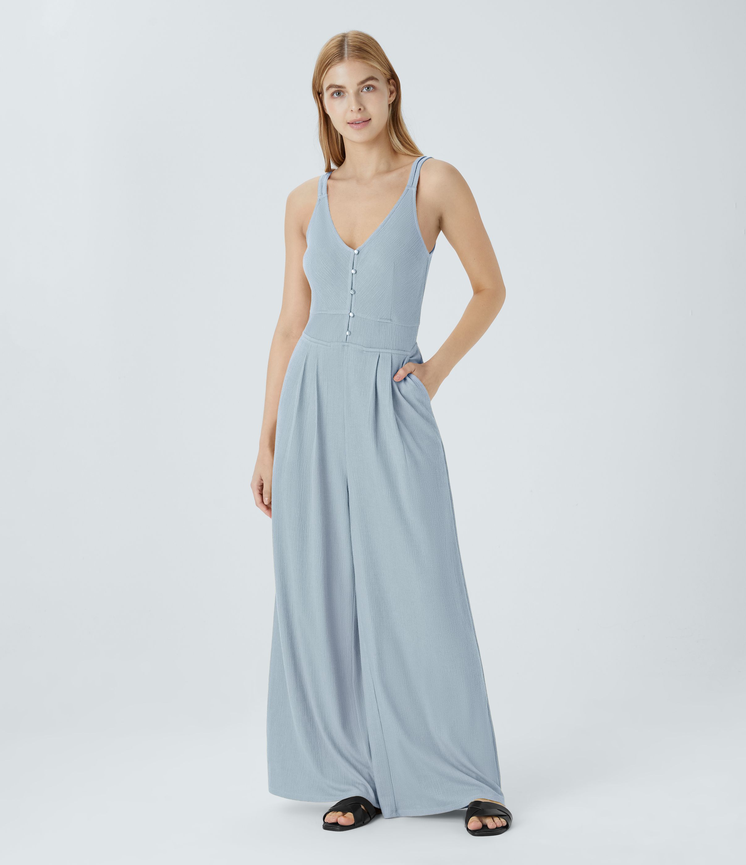 Casual flared jumpsuit with V-neck, double straps, buttons and side pockets