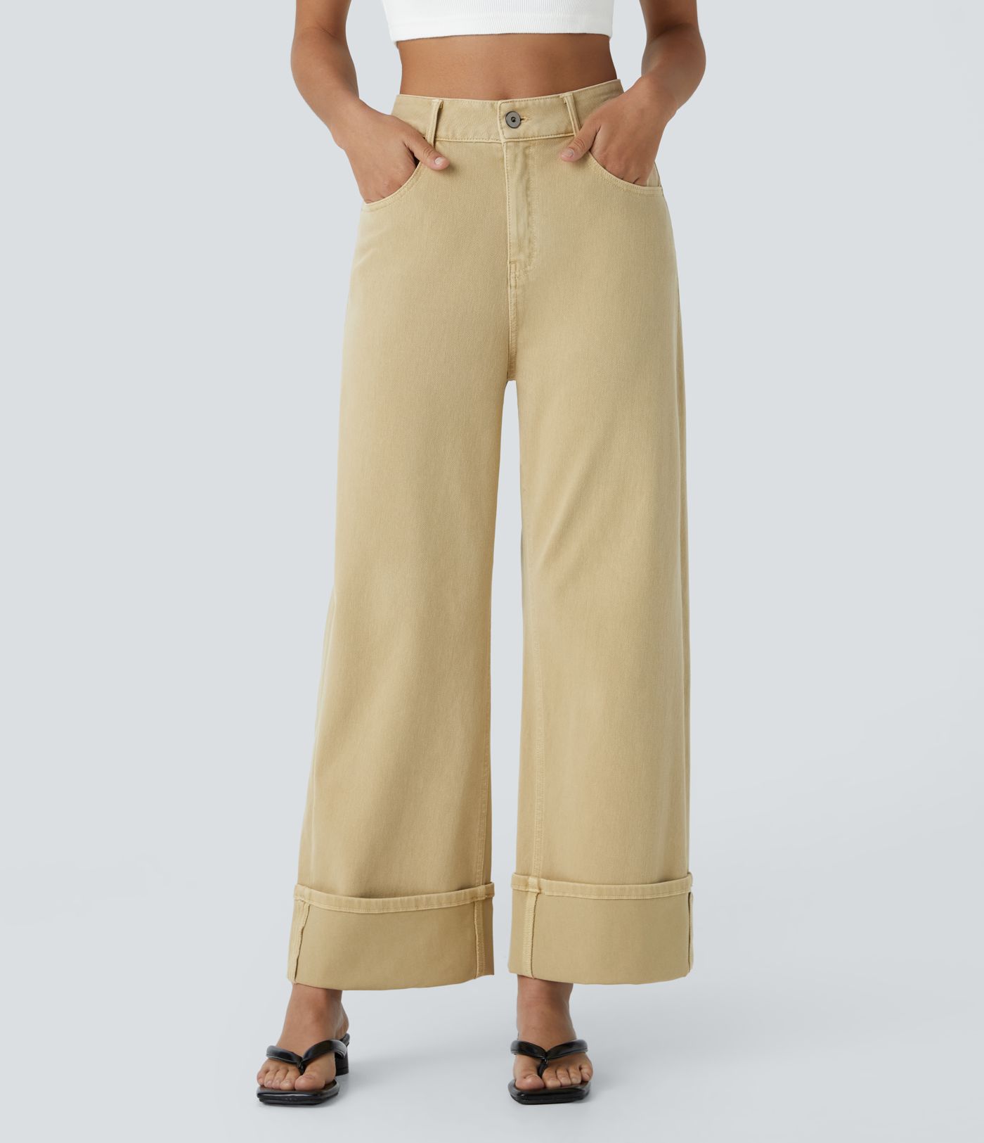 Jean décontracté Halara Flex™ taille haute en maille extensible effet délavé, coupe large à revers et poches multiples