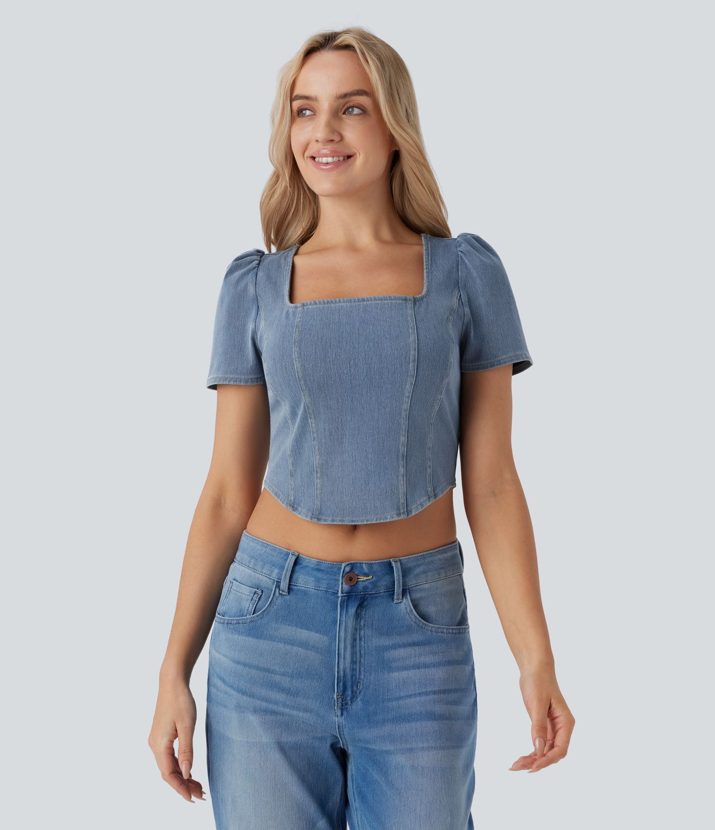 Blouse décontractée courte en maille extensible façon denim Flex™, col carré, manches courtes et ourlet arrondi