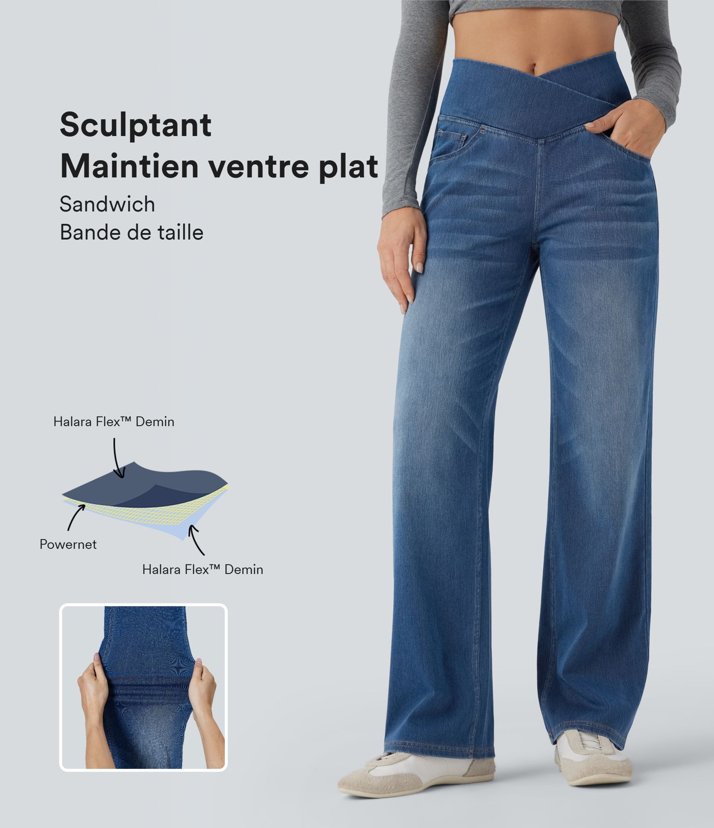 Jean droit décontracté croisé gainant taille haute avec poches Halara Flex™