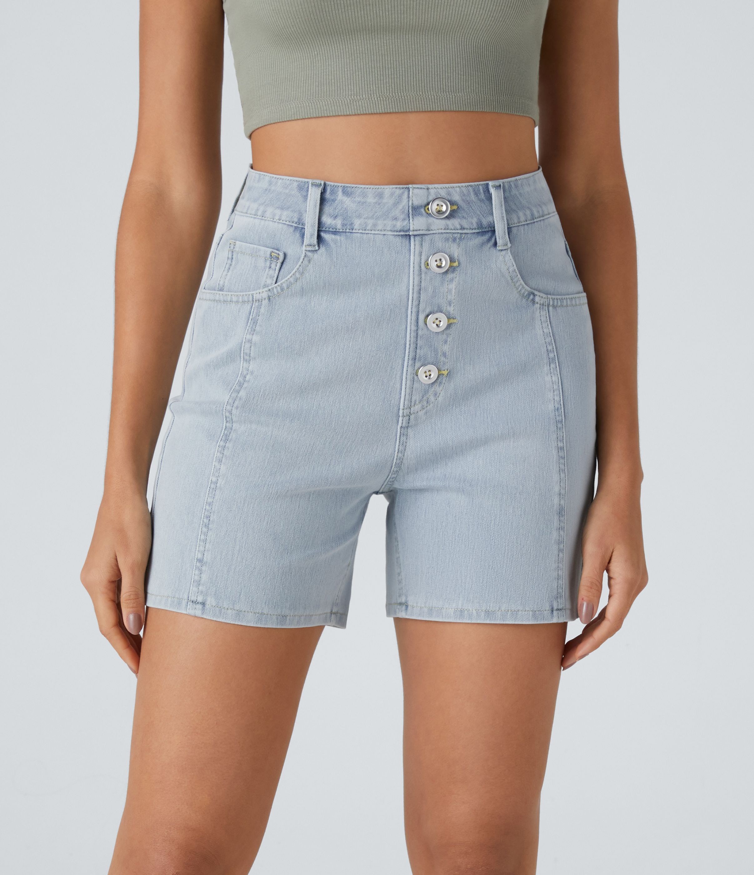 Halara Flex™ Shorts Casual en Denim Tricoté Extensible avec Taille Haute Boutons Décoratifs Multiples Poches