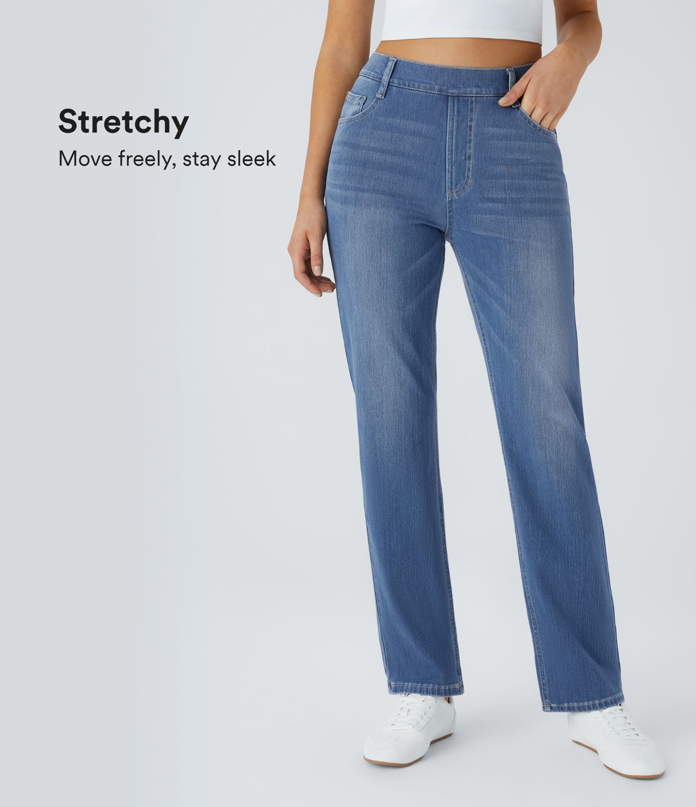 Jean droit Halara Flex™ à taille haute, poches multiples, effet délavé et tissu extensible