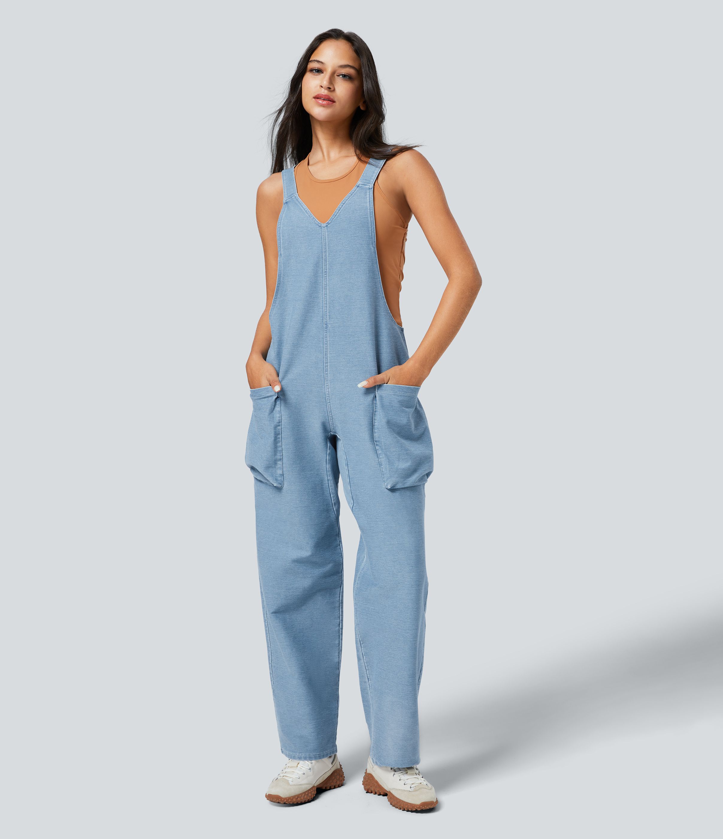 Halara Flex™ Salopette Casual en Denim Tricot Extensible avec Col en V et Poches Latérales