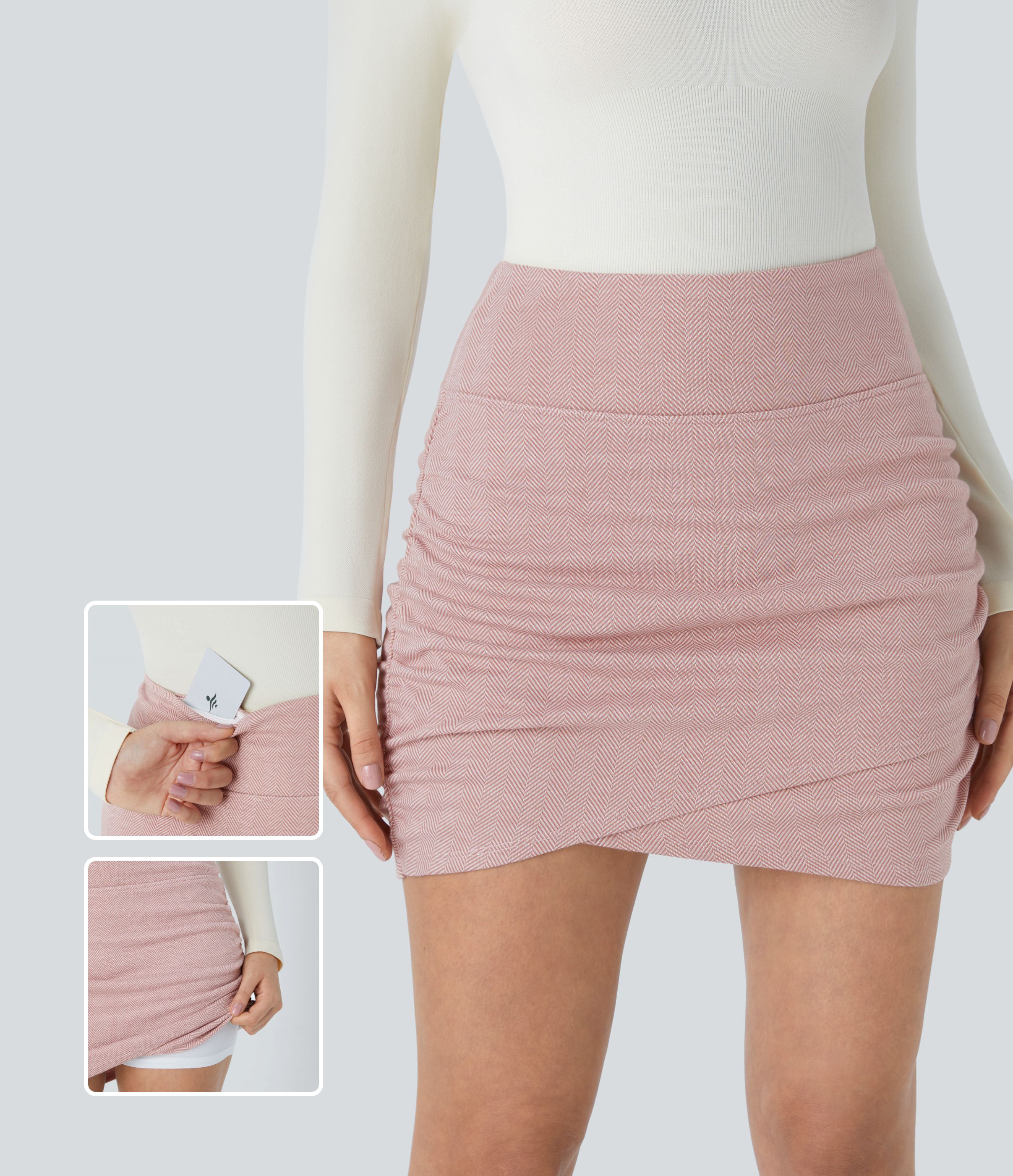 Mini-jupe décontractée 2-en-1 moulante à chevrons taille haute avec poche arrière et fronces