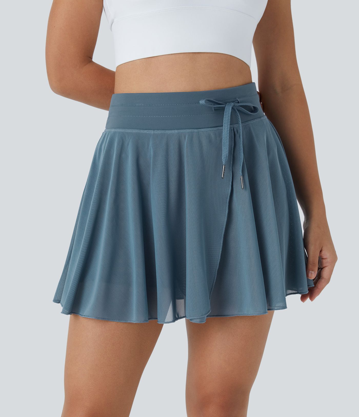 Jupe Casual Évasée Fluide 2 en 1 en Maille Contrastée Taille Haute Cordon de Serrage Poche Latérale