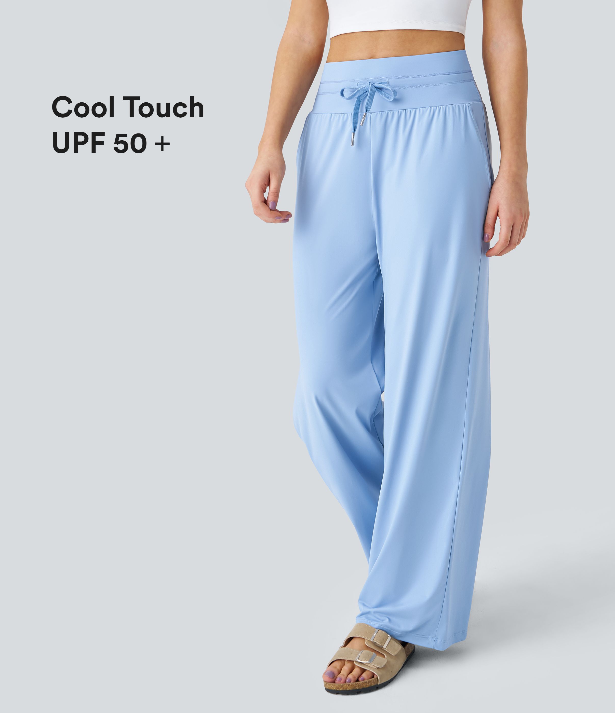 Pantalon Large Casual Taille Haute Cordon de Serrage Poches Latérales Toucher Frais