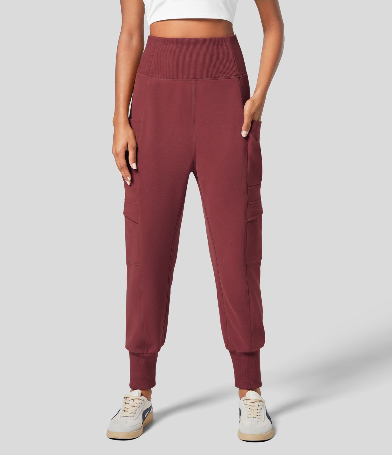 Jogging en Coton Doux Thermique Taille Haute Repliable Poches Latérales Style Harem Cargo
