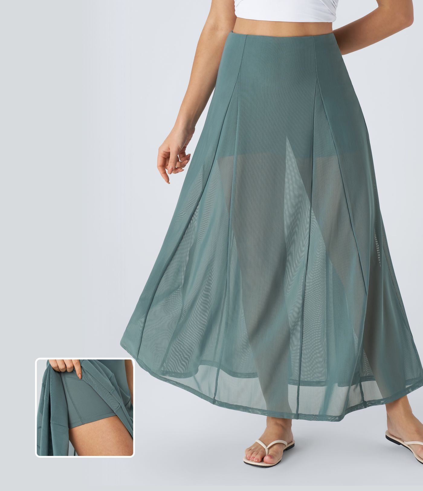 Jupe Evasée Casual Longue 2 en 1 en Maille Transparente Taille Haute