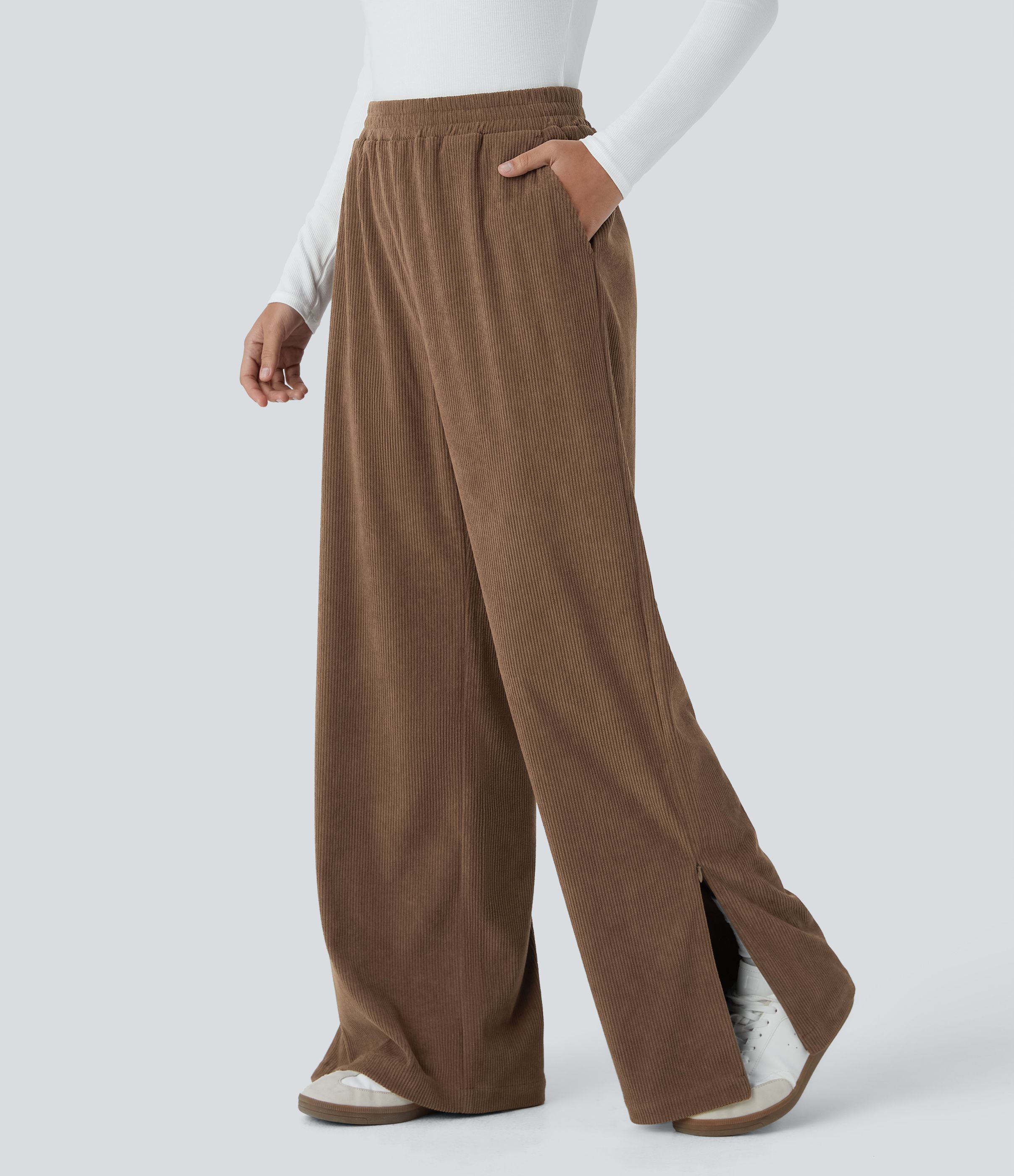 Pantalon décontracté droit en velours côtelé, taille haute, avec poche zippée