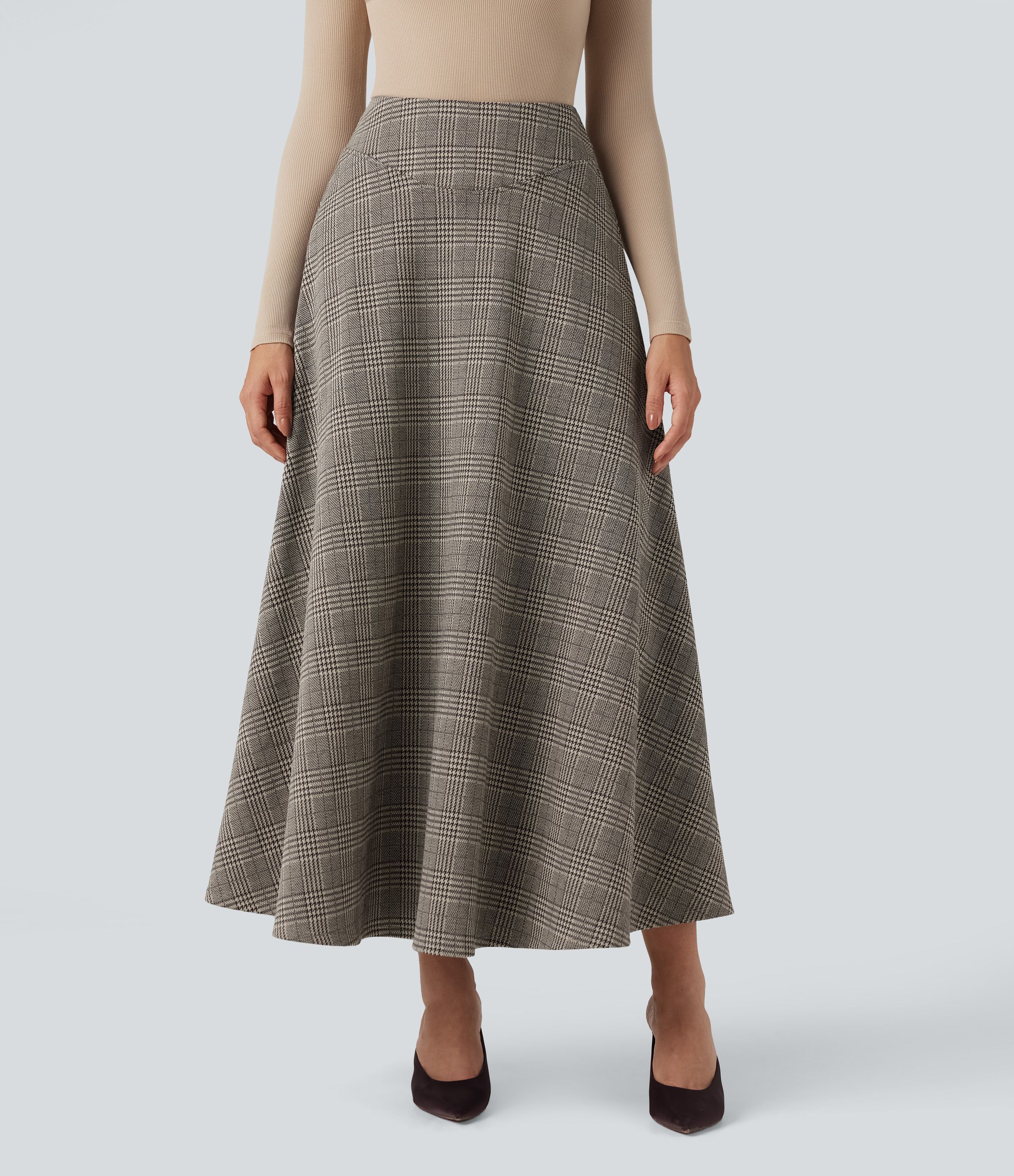 Jupe de travail longue taille haute pied-de-poule à carreaux avec poches