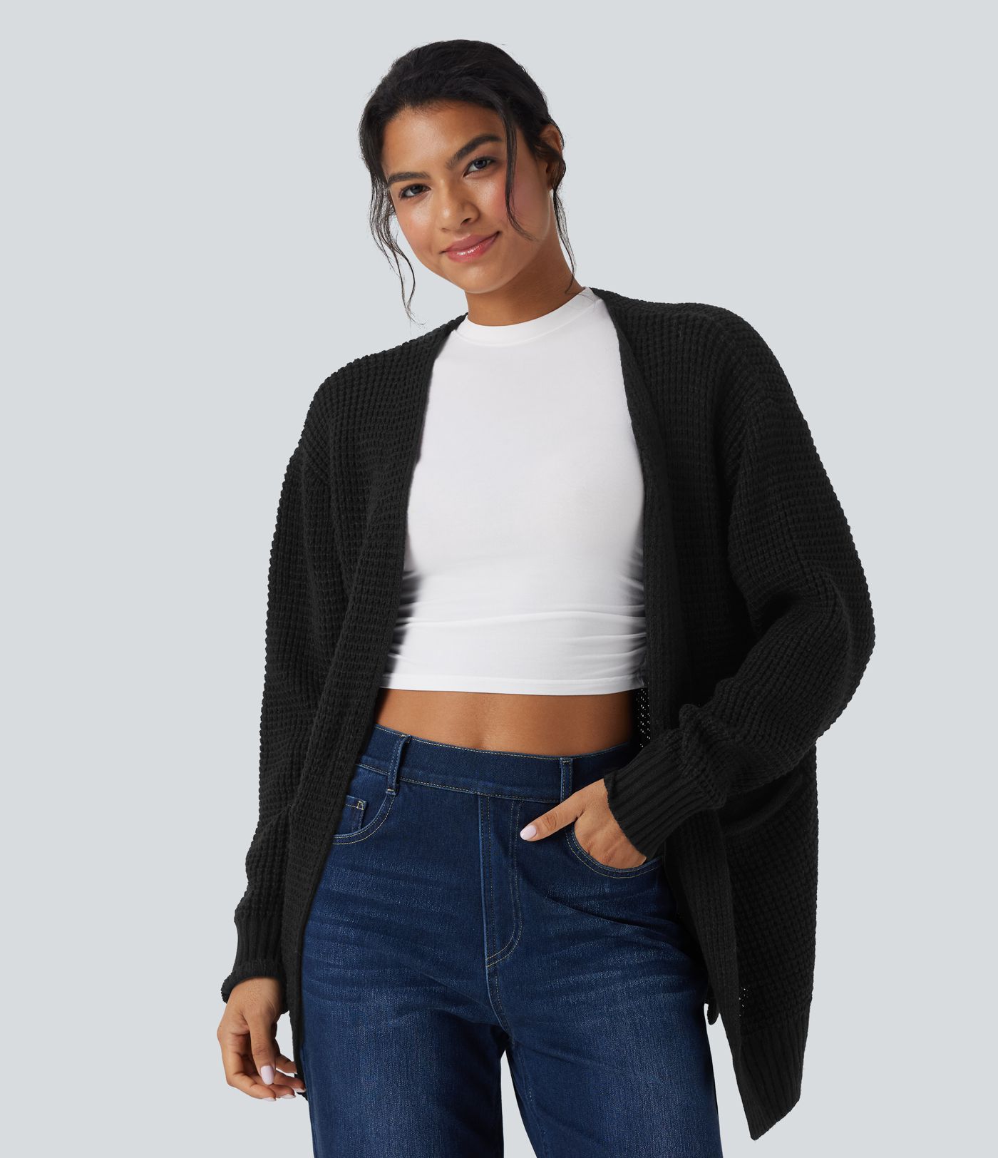 Cardigan décontracté gaufré manches longues avec poches