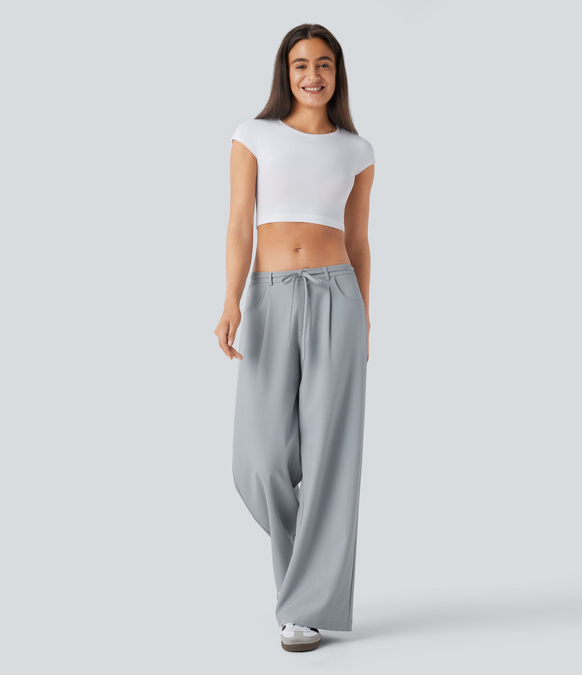 Pantalon tailleur ample à taille basse avec poches latérales et lien à nouer