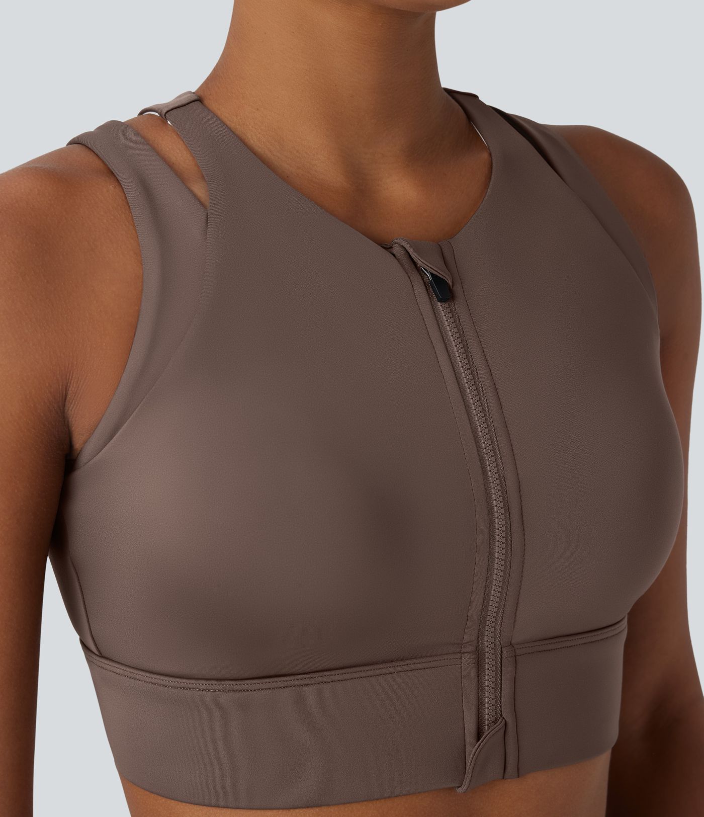 Brassière de danse brillante à maintien léger avec découpes et zip