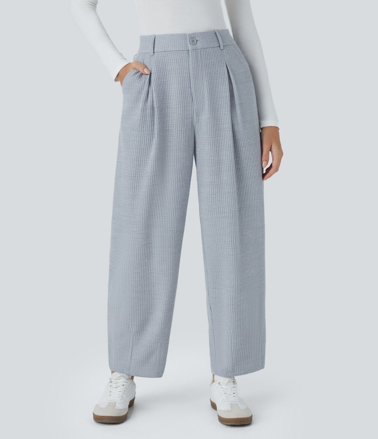 Pantalon décontracté en maille gaufrée taille moyenne avec bouton, fermeture éclair et poches multiples