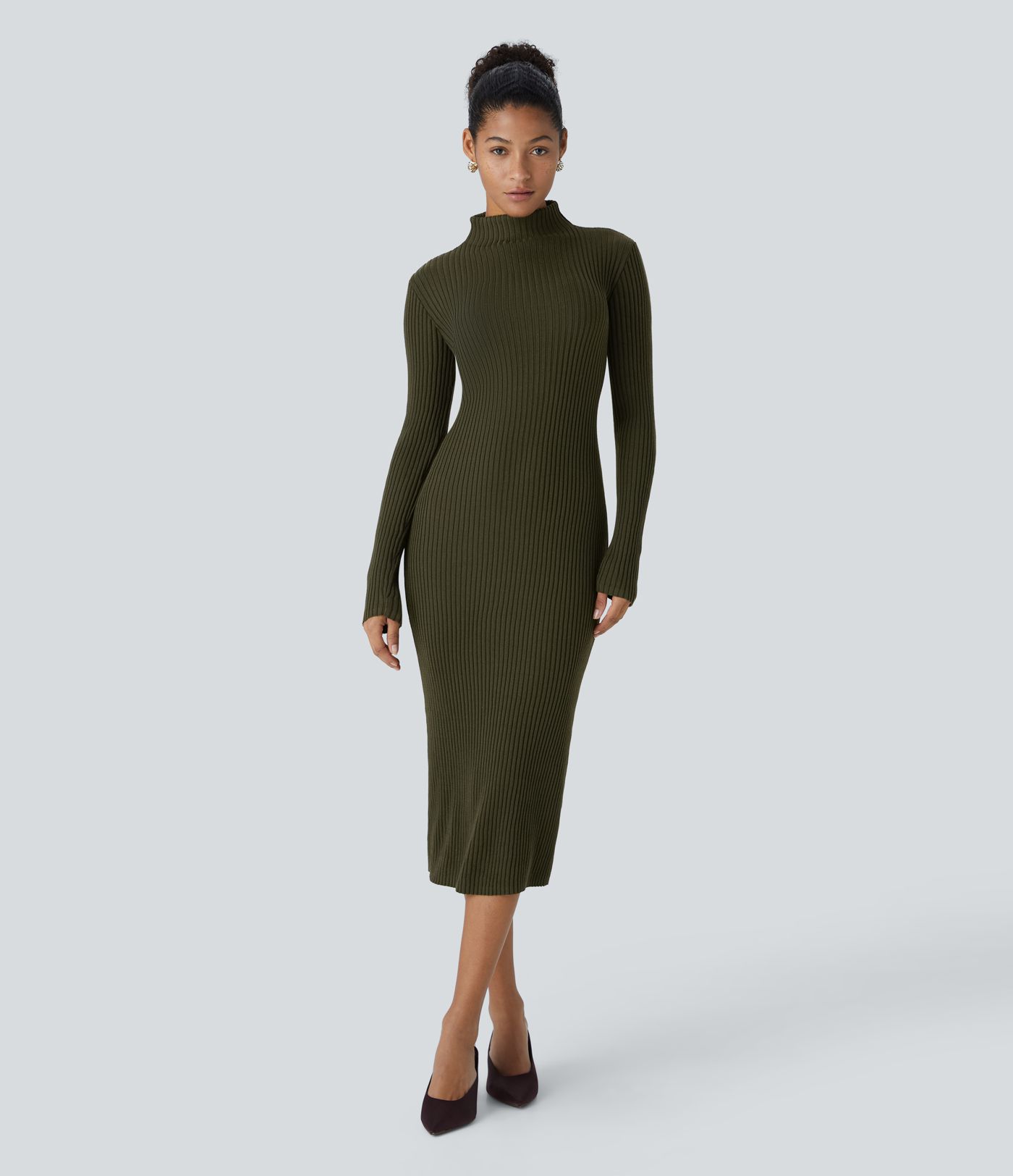 Robe-pull décontractée mi-longue moulante à col montant et manches longues