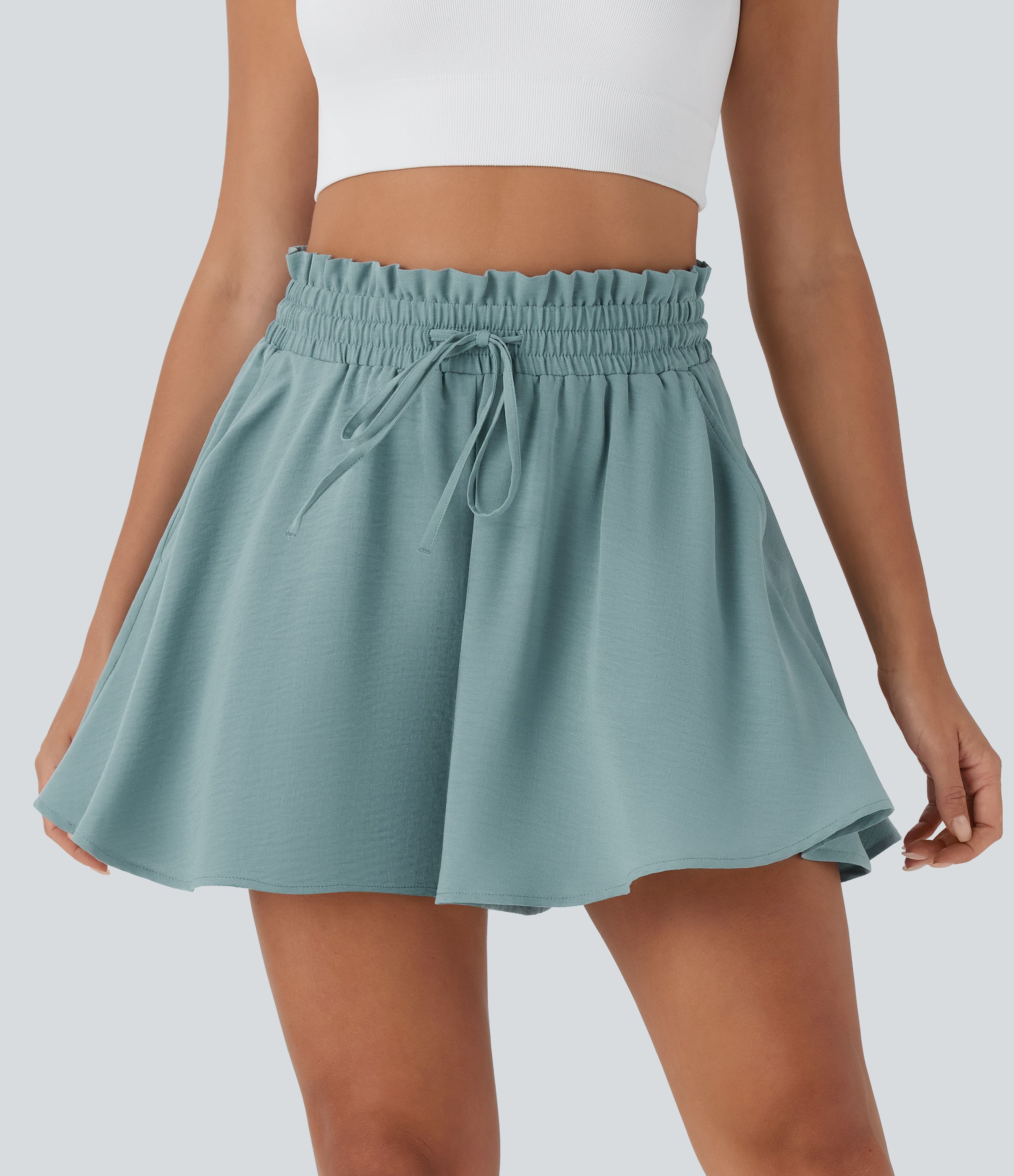 Short large décontracté taille haute façon paperbag avec cordon, poches latérales et aspect lin