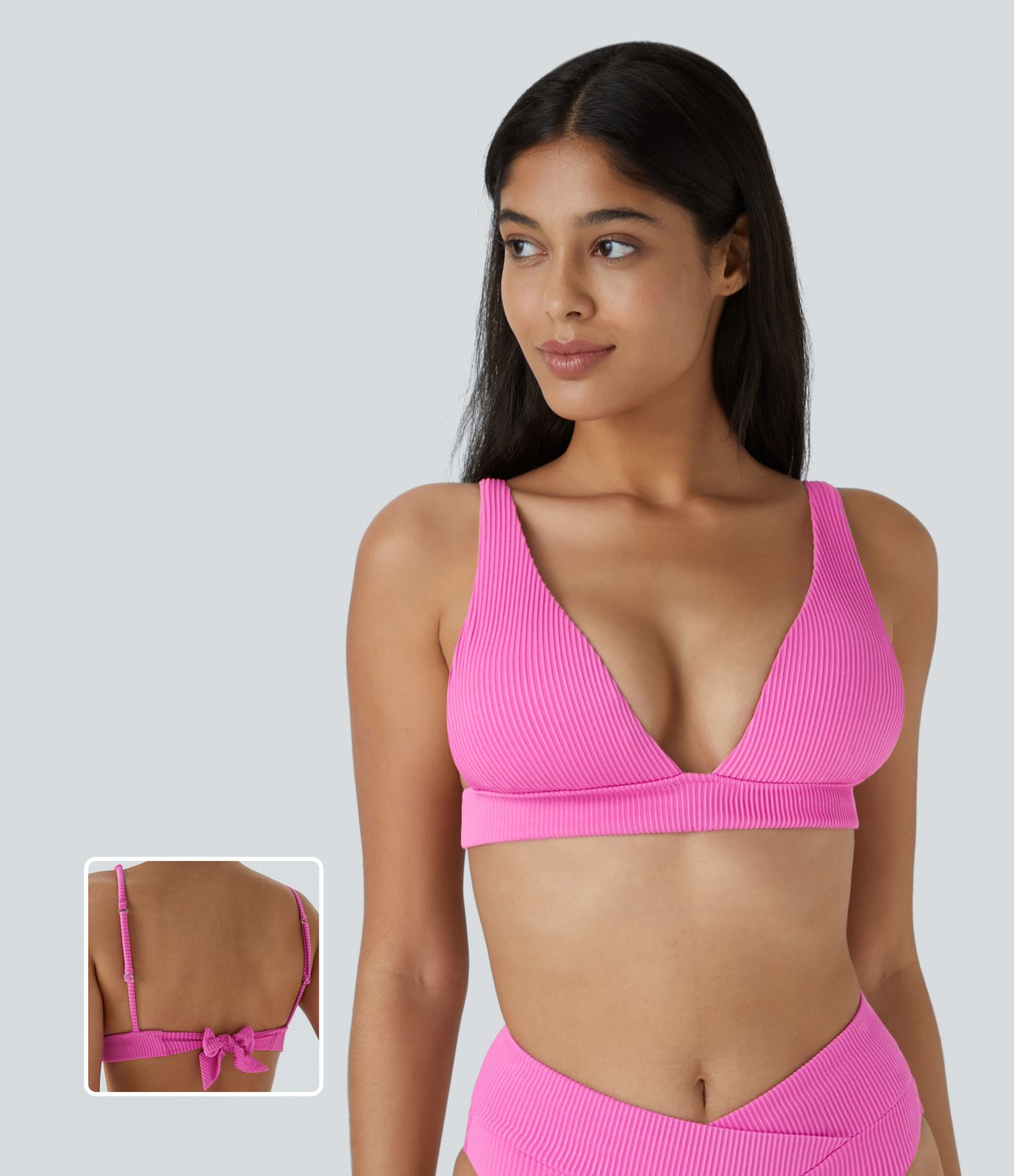 Top Maillot de Bain Bikini Décolleté Profond en Côtelé avec Bretelles Réglables Dos Nu et Noeud au Dos