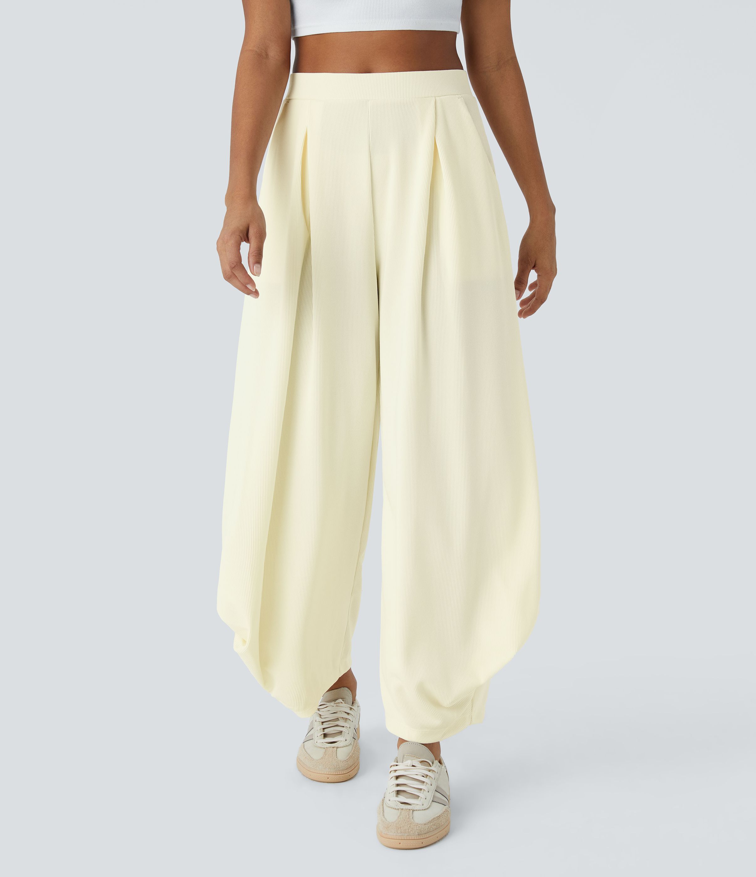 Pantalon Harem Causal à Taille Haute Côtelée avec Plis et Poches Multiples