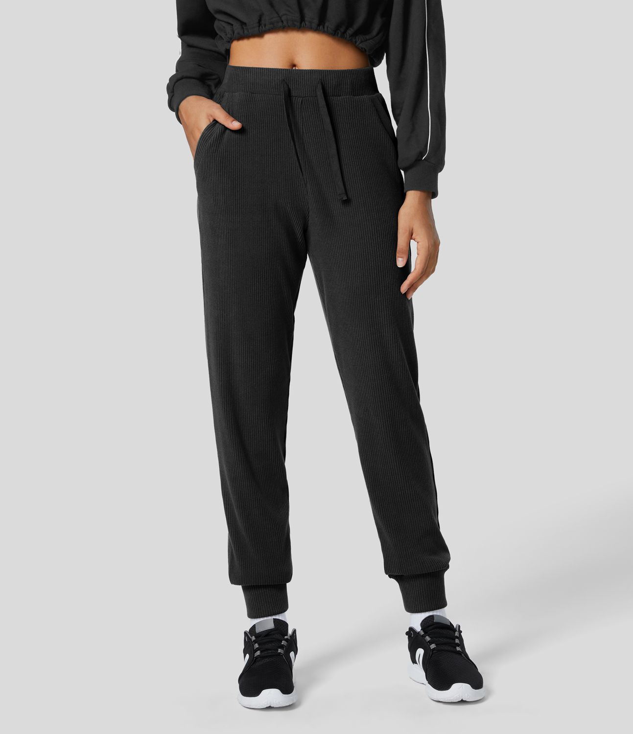 Jogging Casual à Taille Moyenne en Tricot Côtelé avec Cordon de Serrage et Multiples Poches