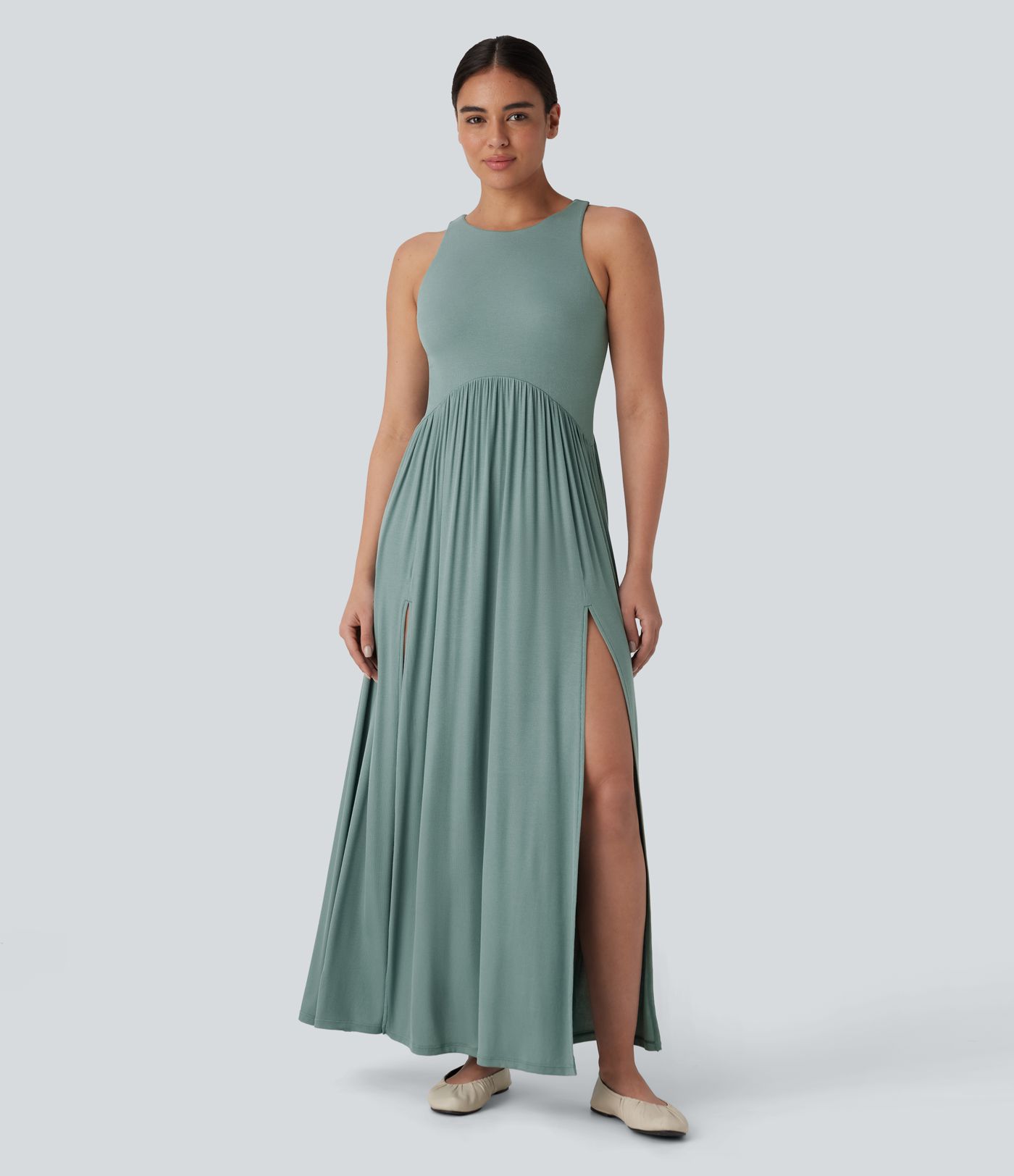 Robe longue décontractée côtelée avec dos nu, bretelles croisées dans le dos et fente