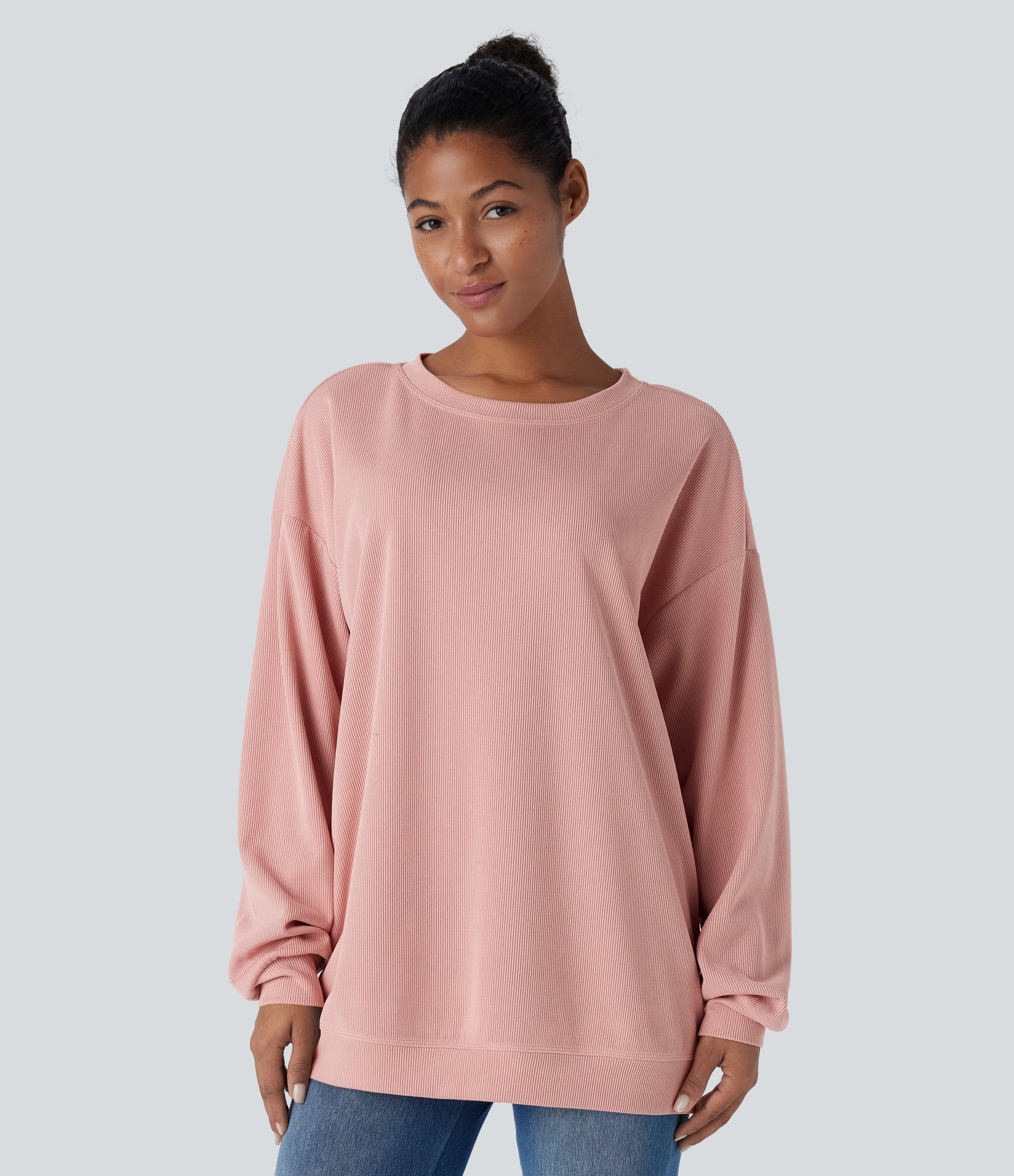 Sweat-shirt décontracté côtelé à col rond, épaules tombantes, manches longues, fermeture éclair et fente