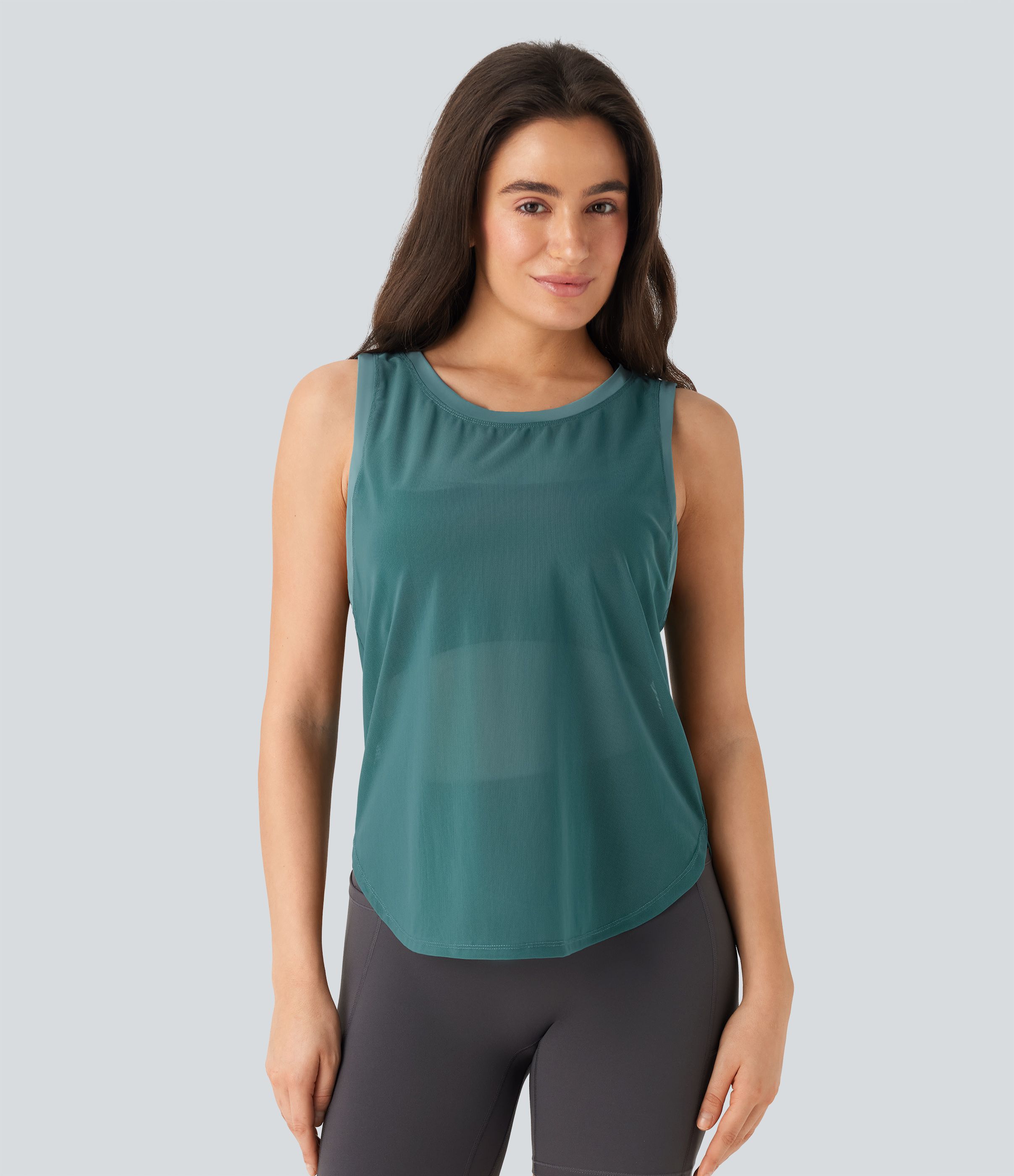 Haut de sport transparent pour yoga sans manches avec ourlet courbé