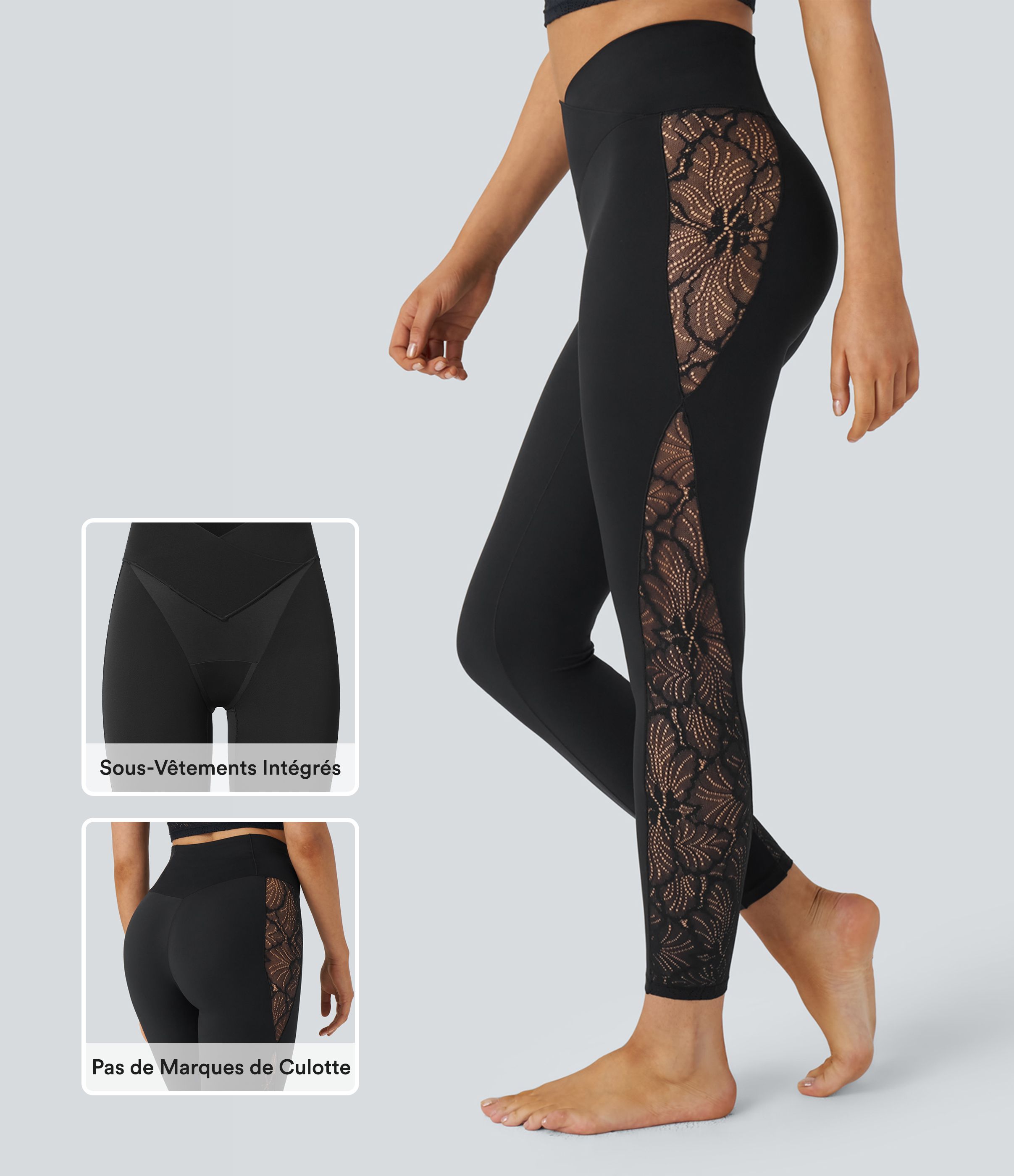 Legging de yoga Softlyzero™ taille haute avec design croisé, dentelle contrastée, sous-vêtement intégré, poche et protection UPF50+