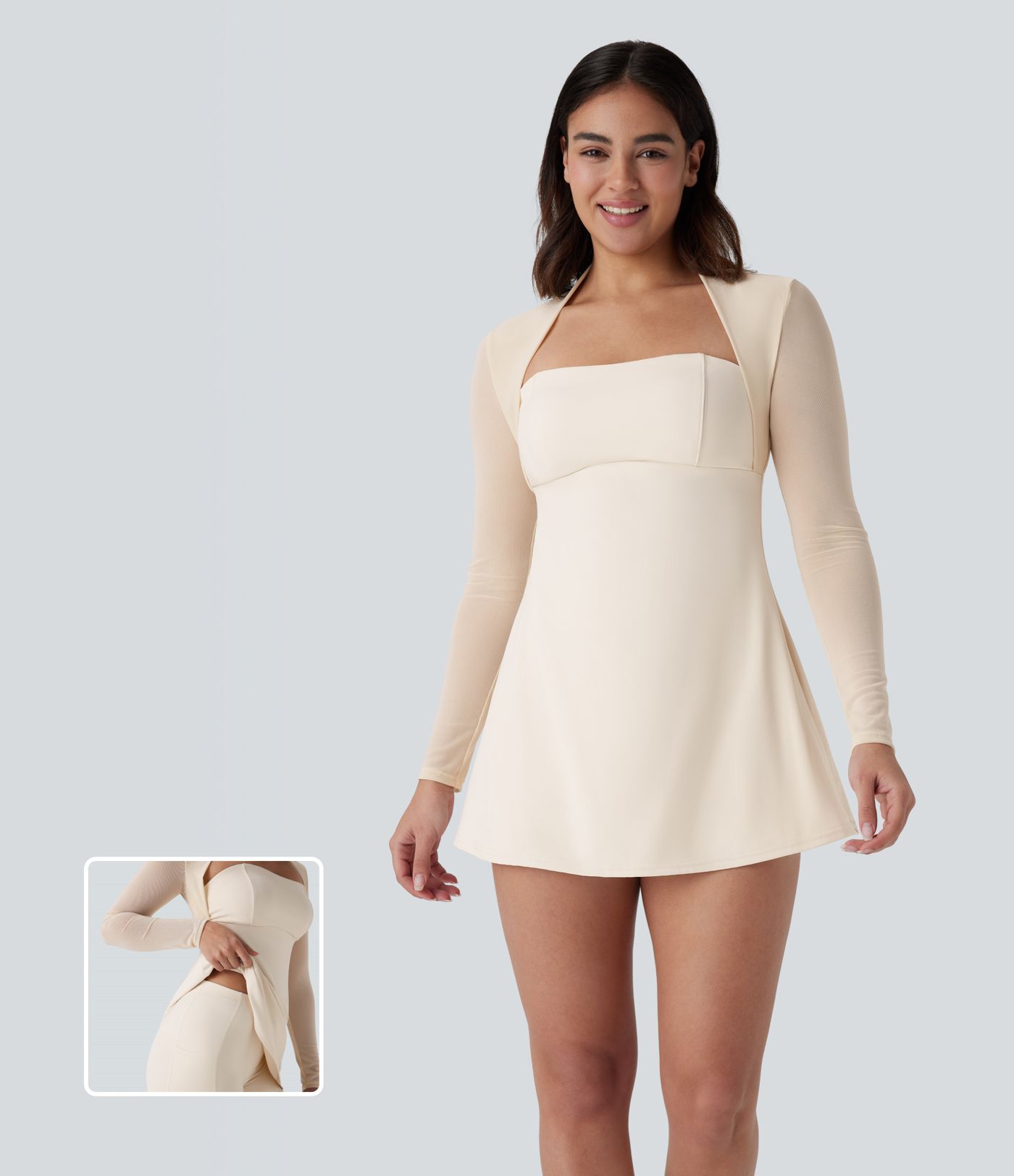 Softlyzero™ Plush Robe de danse courte 2 pièces à manches longues avec résille contrastée et poche latérale