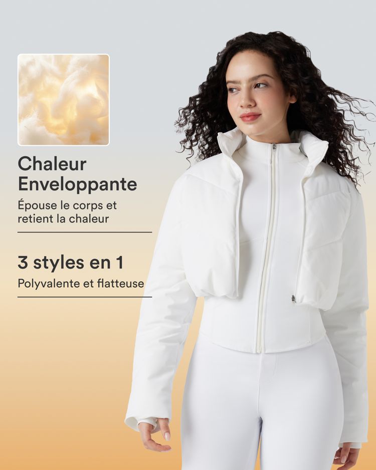 PuffFlex Manteau doudoune 3-en-1 court casual à col montant et veste à ourlet arrondi avec passants pouces et poche