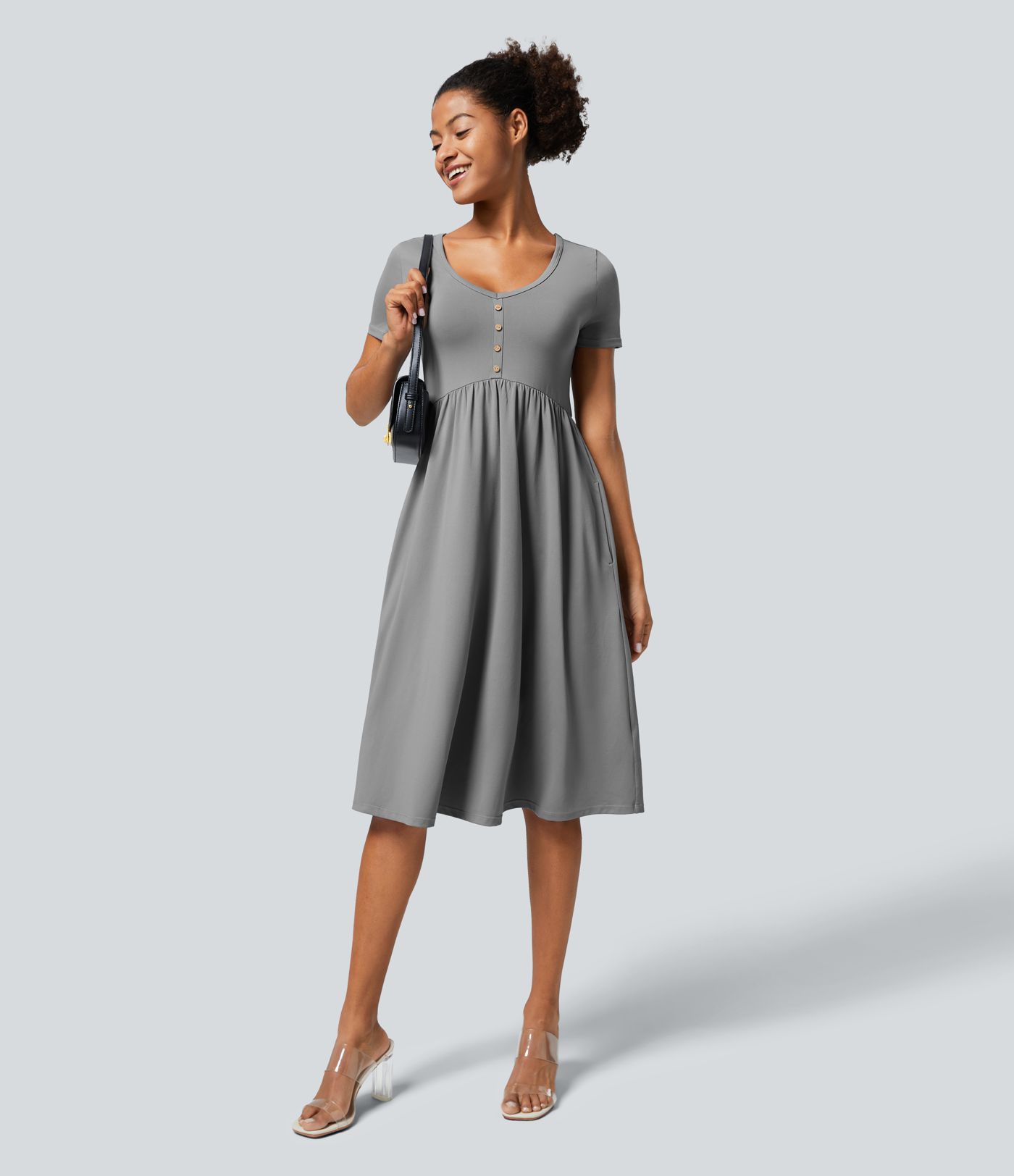 Robe Casual Midi Col en V Boutons Décoratifs Manches Courtes Poches Latérales et Plis
