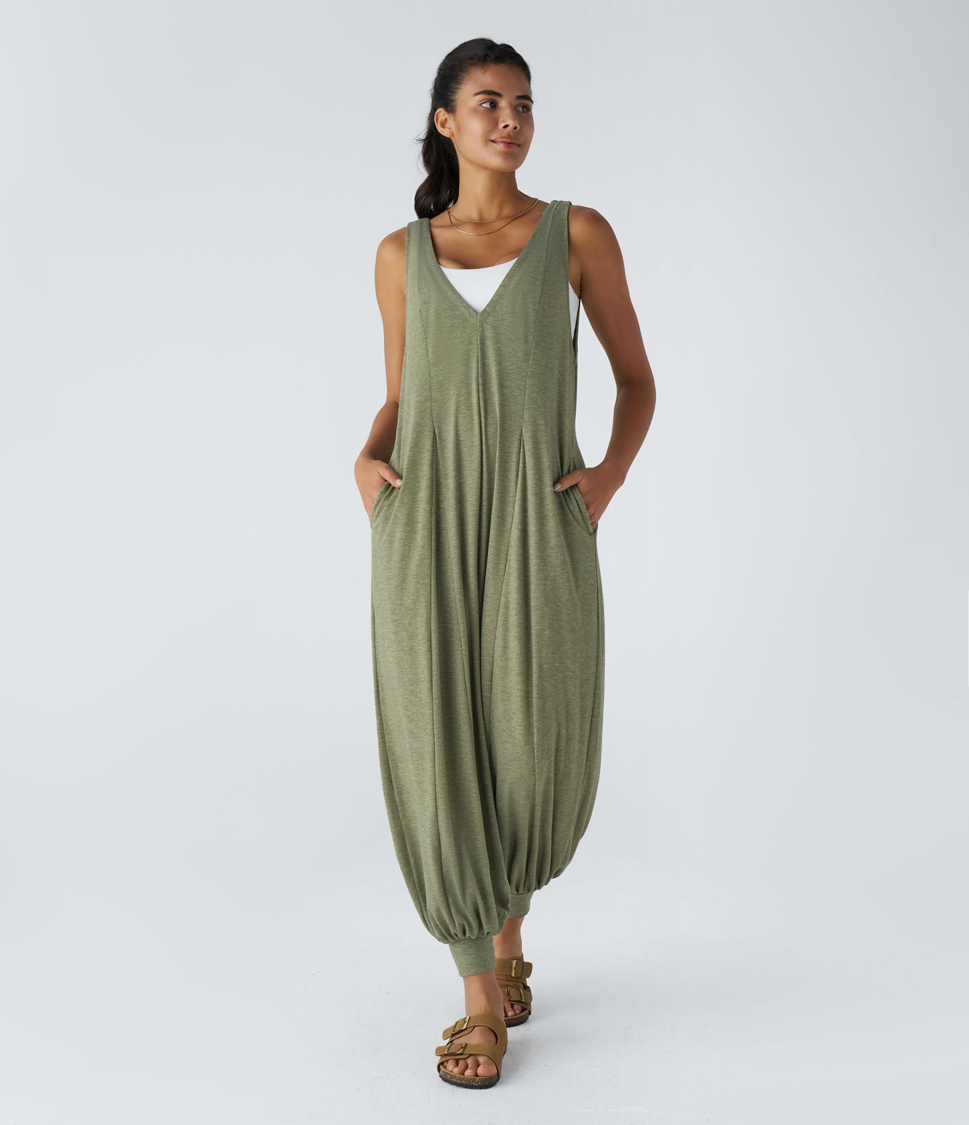 Combinaison Casual Fluide Drapée Poche Latérale Col en V Jambe Large