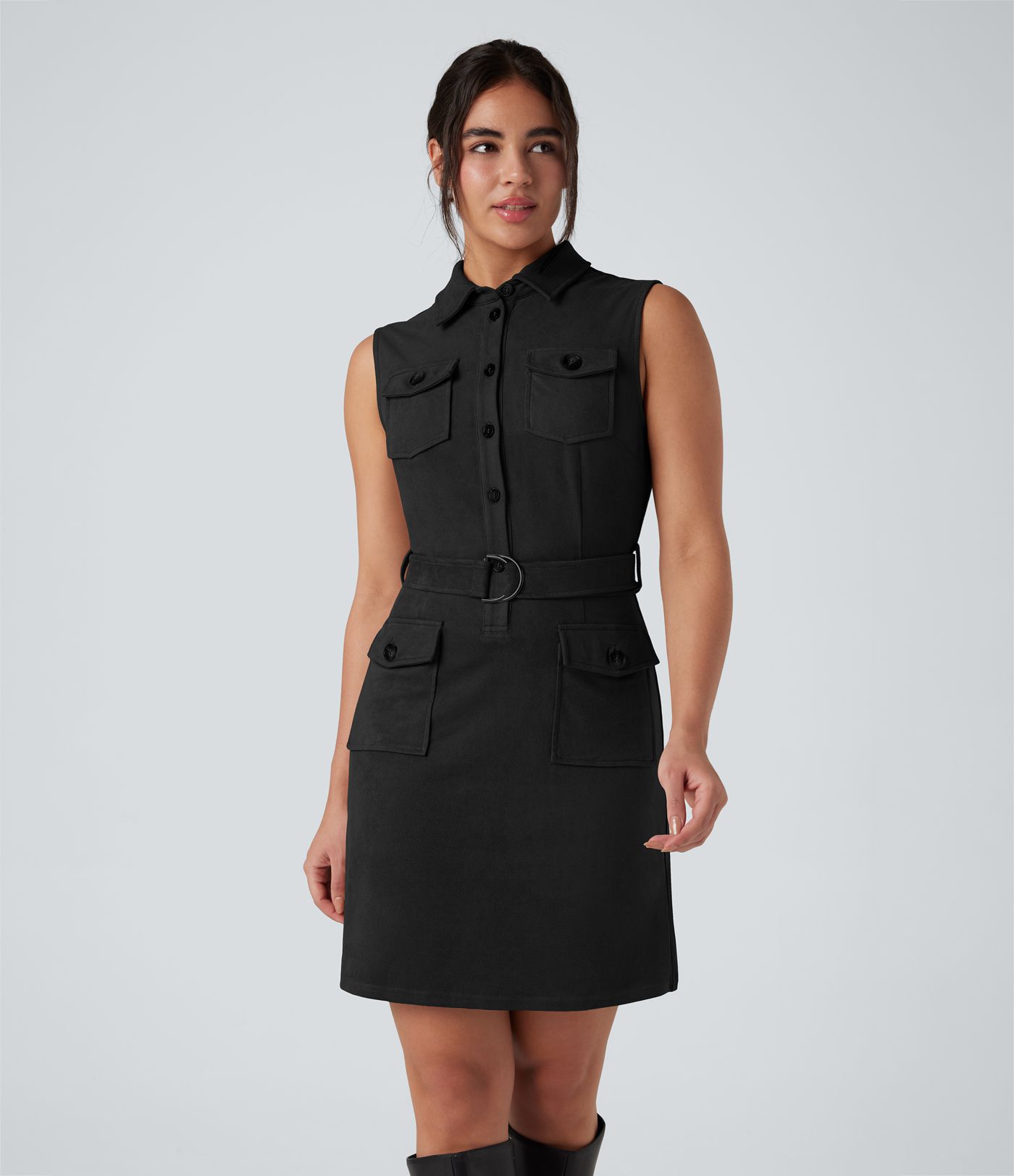 Robe mini daim col chemise ceinturée sans manches avec poches