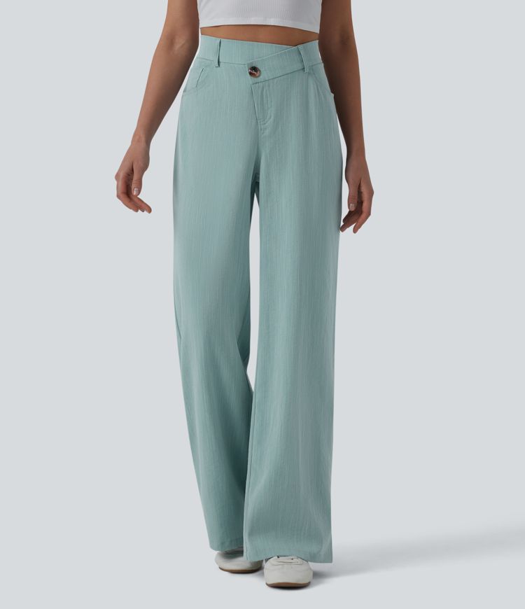 Pantalon large casual taille haute croisée aspect lin avec poches