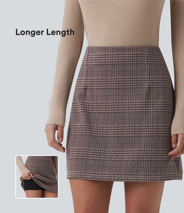 Jupe mini tailleur taille haute 2-en-1 à carreaux pied-de-poule - Longueur rallongée