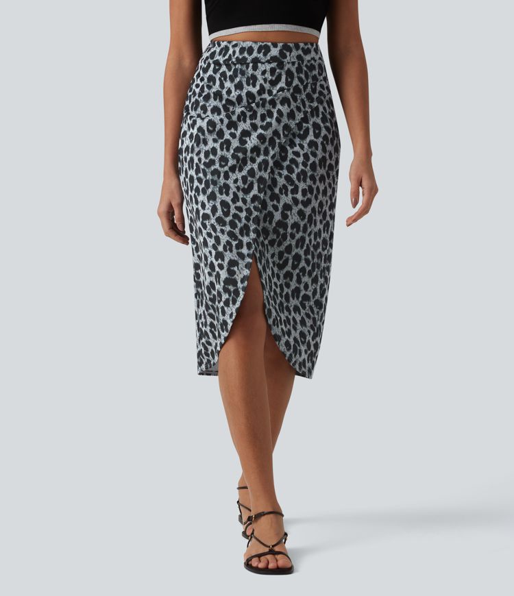 Jupe midi casual tulipe taille haute froncée en tissu gaufré imprimé léopard