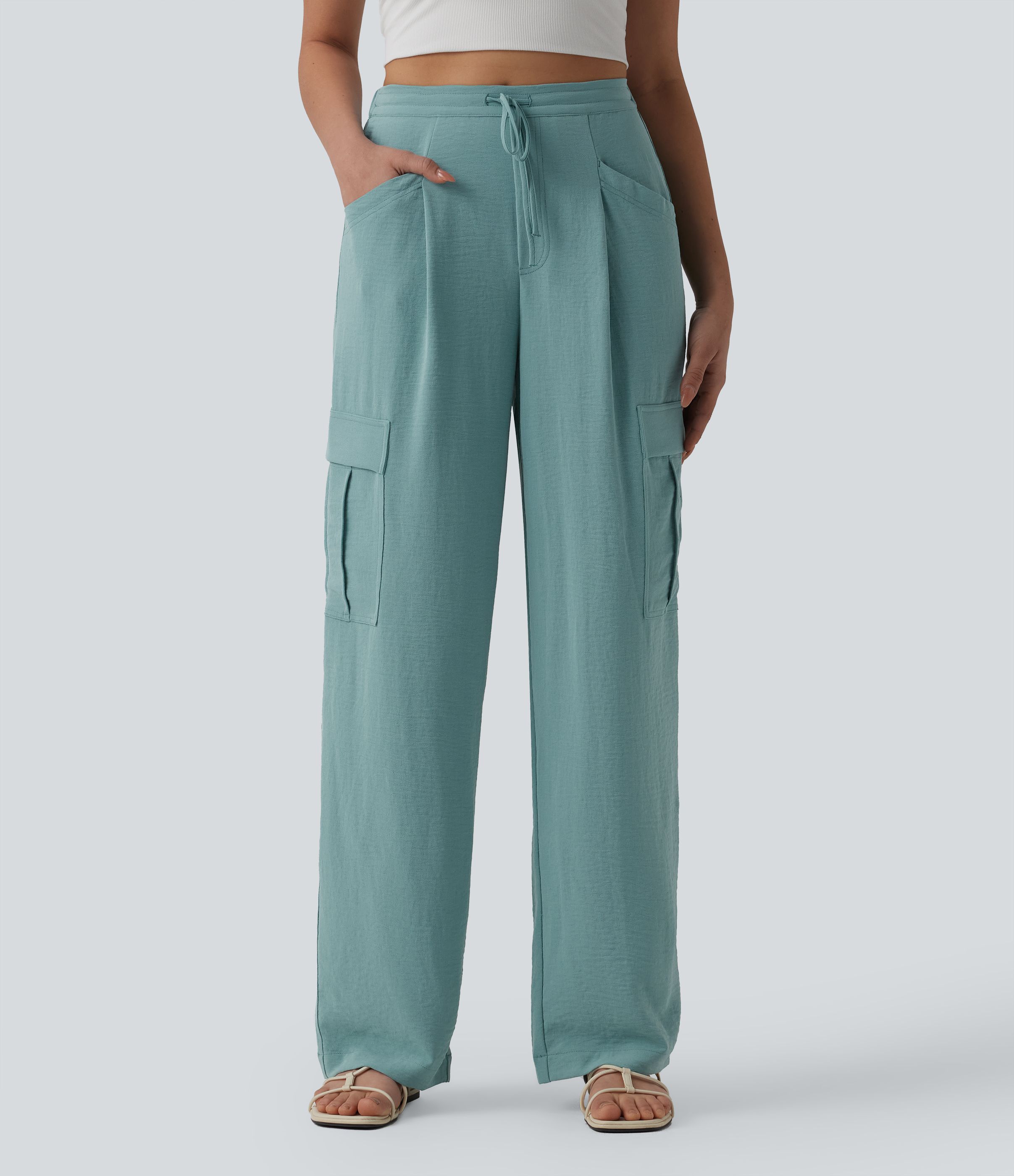 Pantalon cargo casual coupe droite taille mi-haute aspect lin à cordon de serrage avec poches